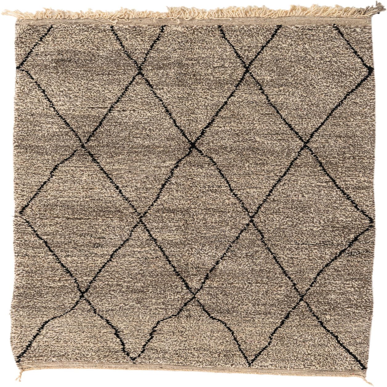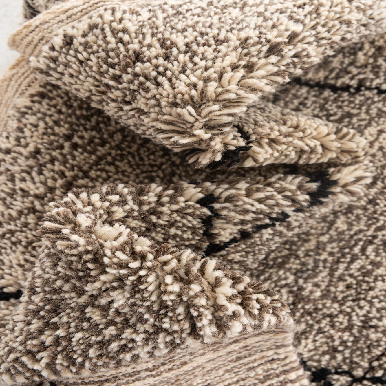 A 5x8 rectangular Moroccan shag rug in brown and tan with a black tribal diamond pattern, ideal for a living room.