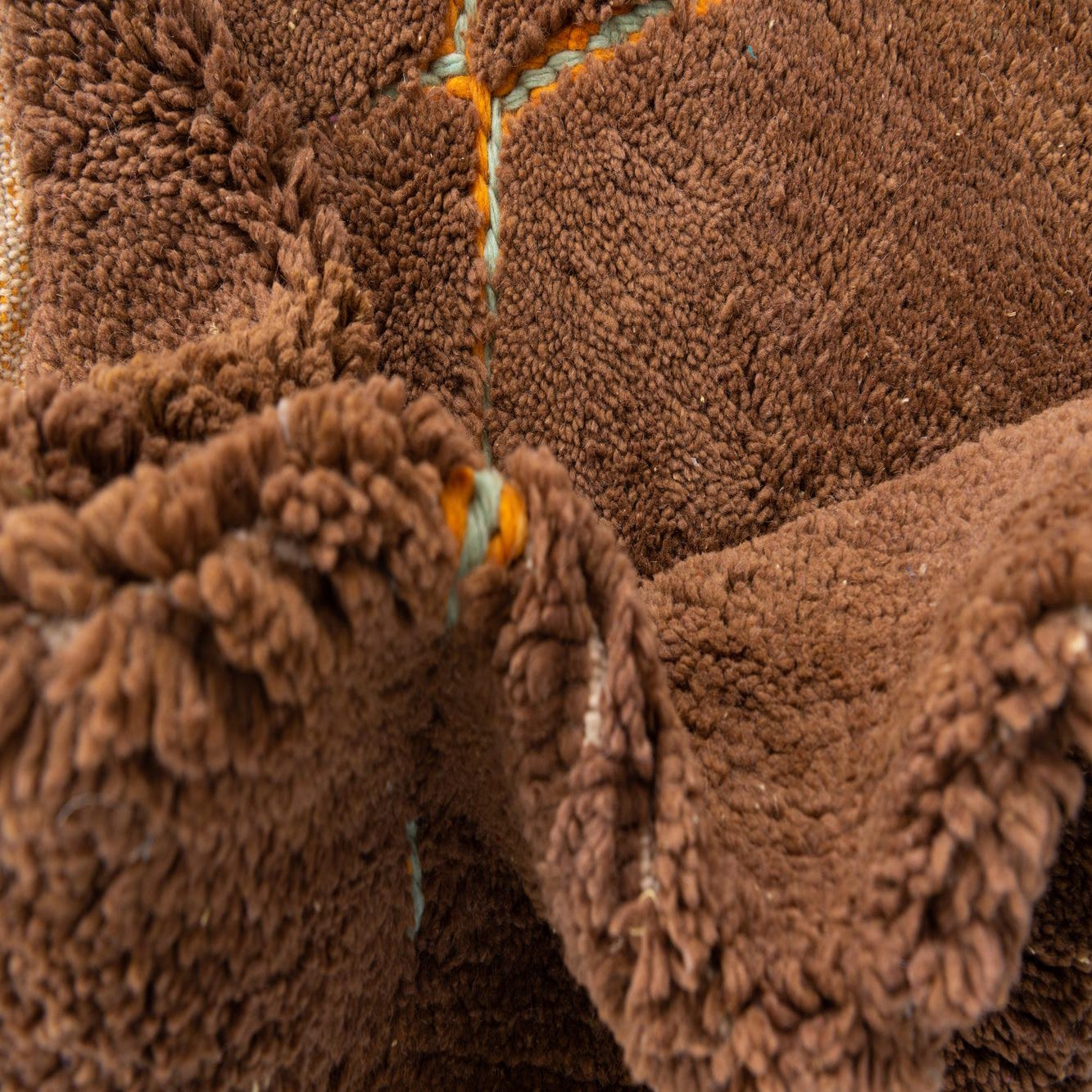 A 5x8 rectangular brown shag rug with a subtle tribal X-pattern in light blue and orange, and fringed ends.