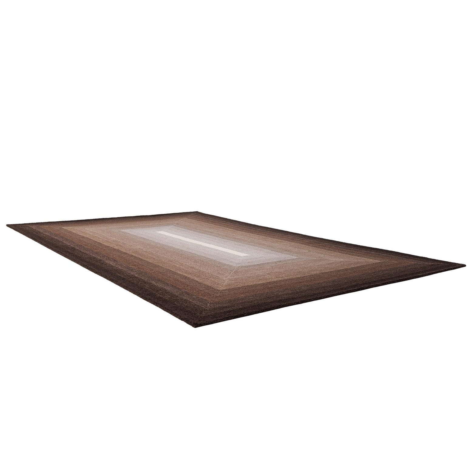 A 5x8 rectangular modern wool rug featuring a gradient ombre pattern of browns and tans, with a high pile.