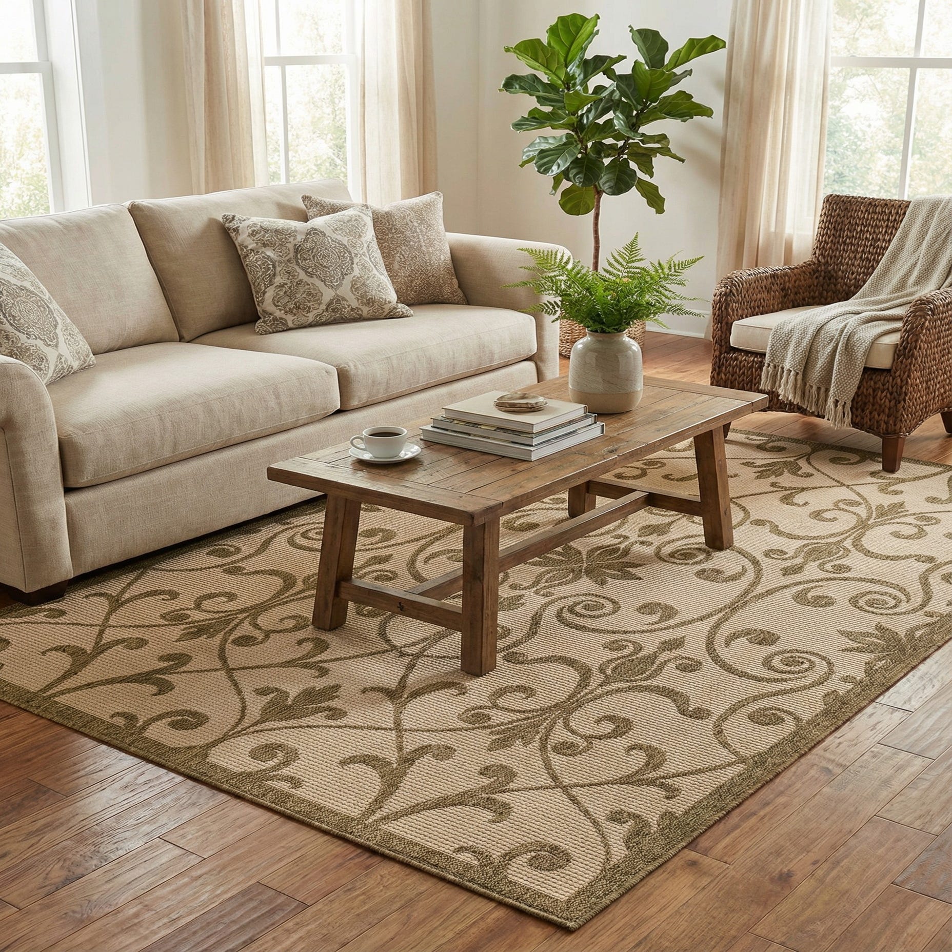 Machine made from 100% polypropylene, the surface has a low-profile, tightly woven texture with a subtly raised motif that adds gentle depth underfoot. That construction makes it a natural choice for covered outdoor living areas, a sunroom, or a casual dining space, and it pairs well with natural wood furniture, wicker or rattan seating, and muted, earth-toned textiles for a cohesive, inviting setting.