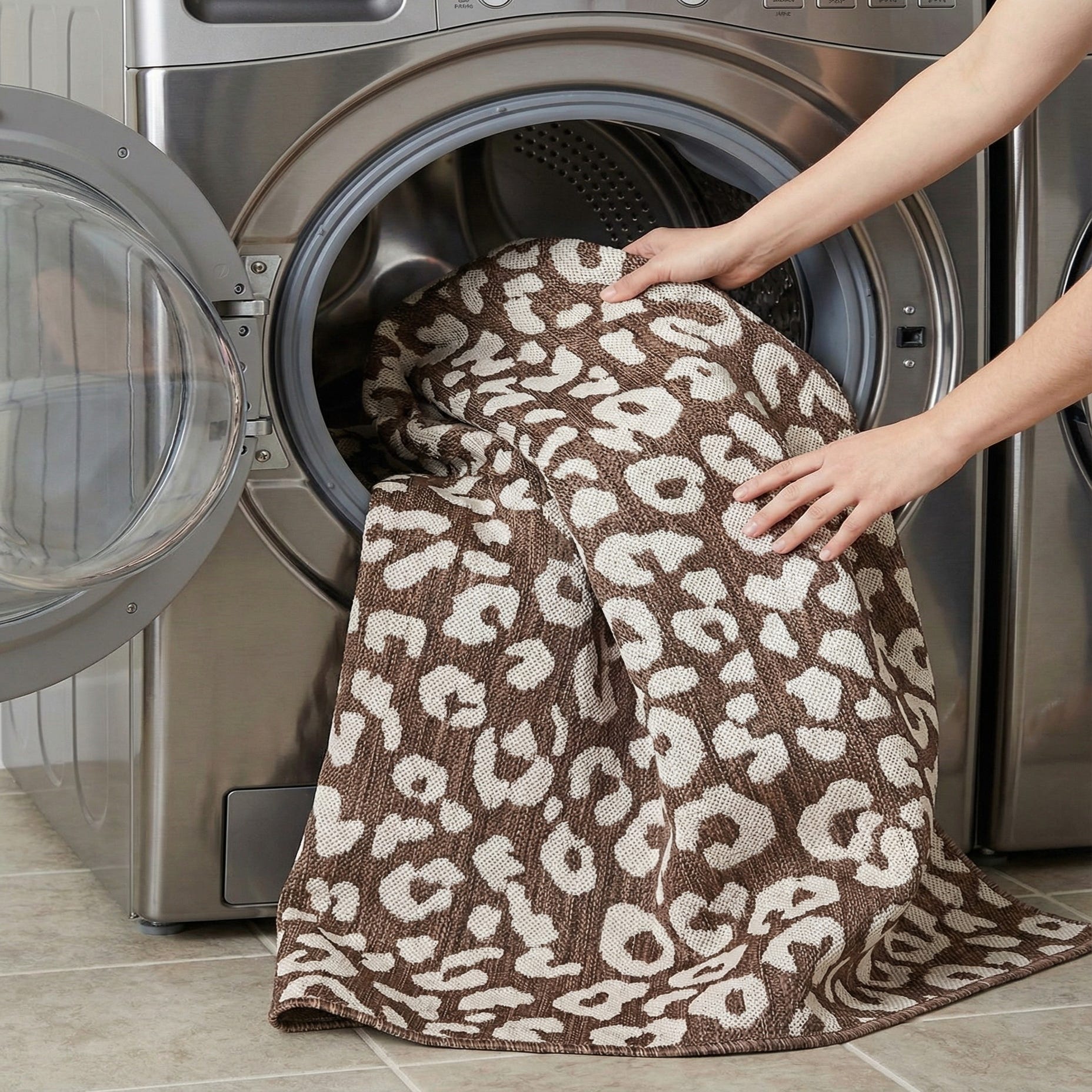 A 5x8 rectangular indoor/outdoor rug featuring a modern leopard print pattern in shades of brown and tan, ideal for a patio or living room.