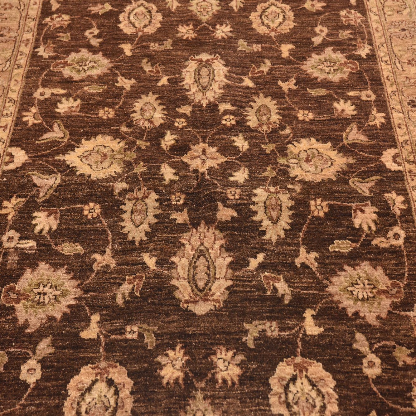 A 5x8 rectangular Peshawar Ziegler rug in rich brown with a tan border, featuring intricate traditional botanical and floral patterns.
