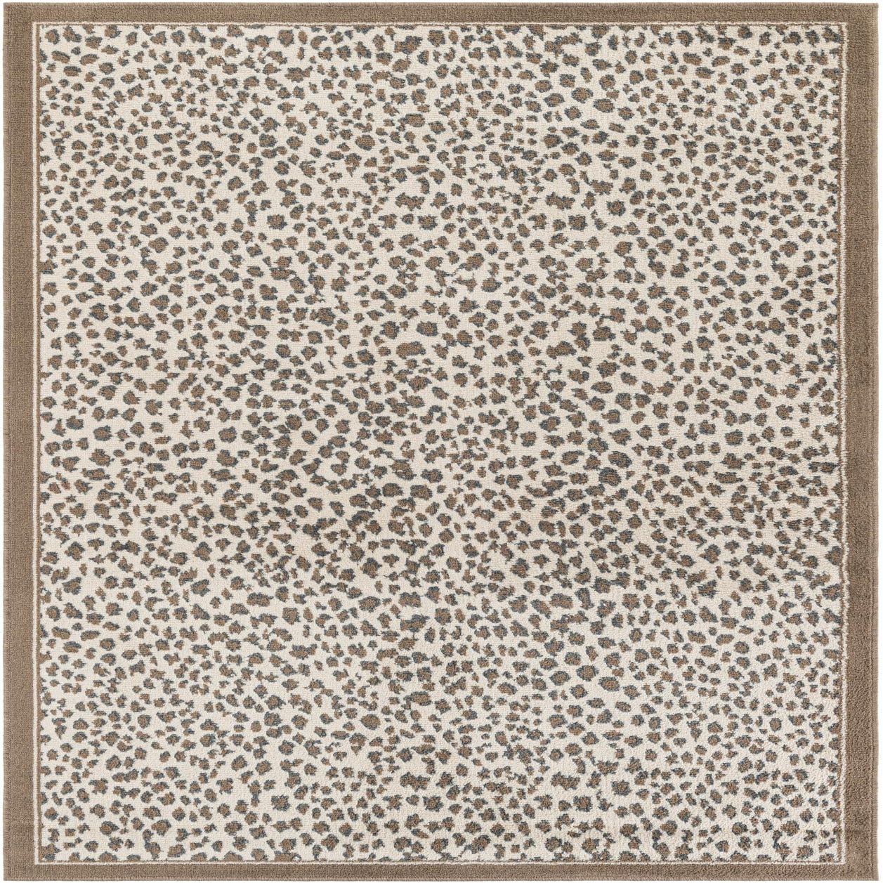 A 5x8 rectangular Savannah collection rug with a modern leopard print in browns and tans, featuring a solid brown border.