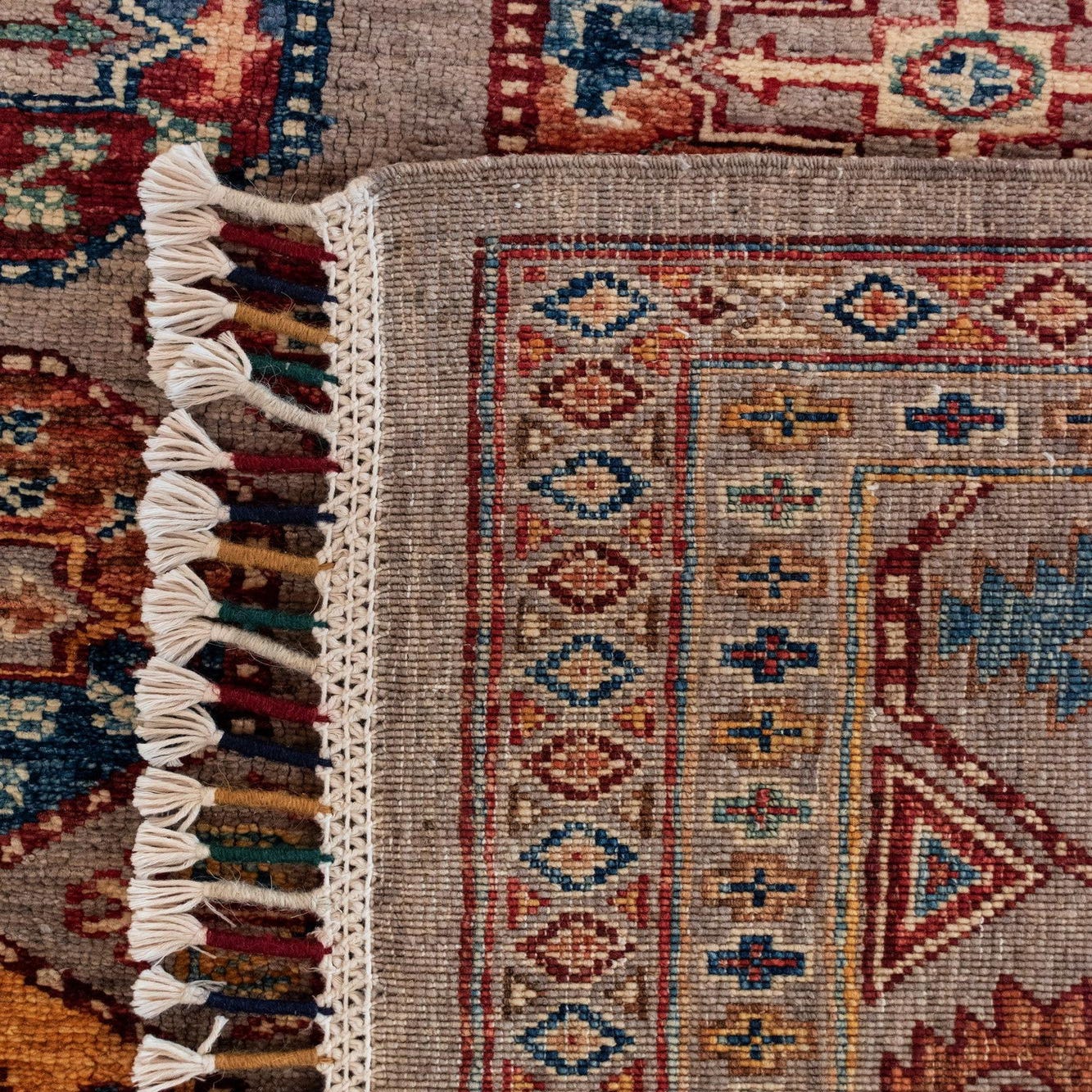 The rug's woolen construction gives it a tactile texture, providing both visual interest and underfoot comfort. Its handcrafted nature ensures that each rug is unique, with slight variations that add to its artisanal charm.