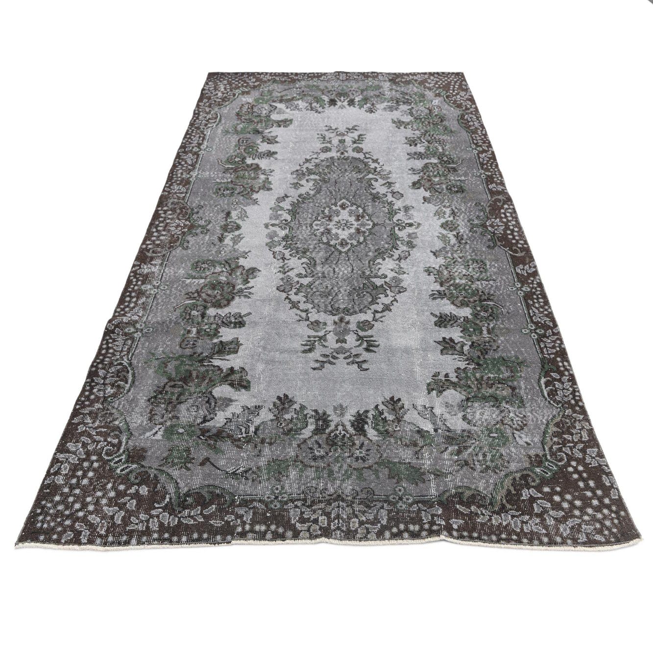 The Ultra Vintage collection presents a hand-made 5x8 rug meticulously crafted from 100% wool, imparting a sense of warmth and tactile comfort. This piece showcases a traditional pattern featuring an intricate central medallion, floral motifs, and an elegant border, all harmonized in a rich color palette of brown, gray, light brown, hunter green, and silver. The complexity of the pattern is set against a deep brown background, which grounds the design and lends it a classic ambiance.