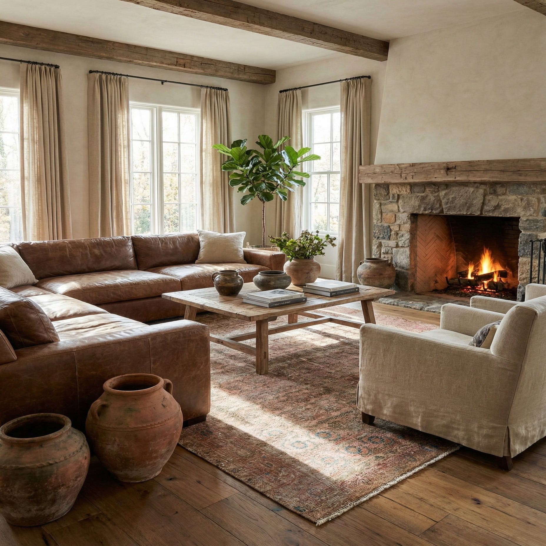 Primary color is Brown. Colors in this rug include: Brown, Rust Red, Ivory, Navy Blue.