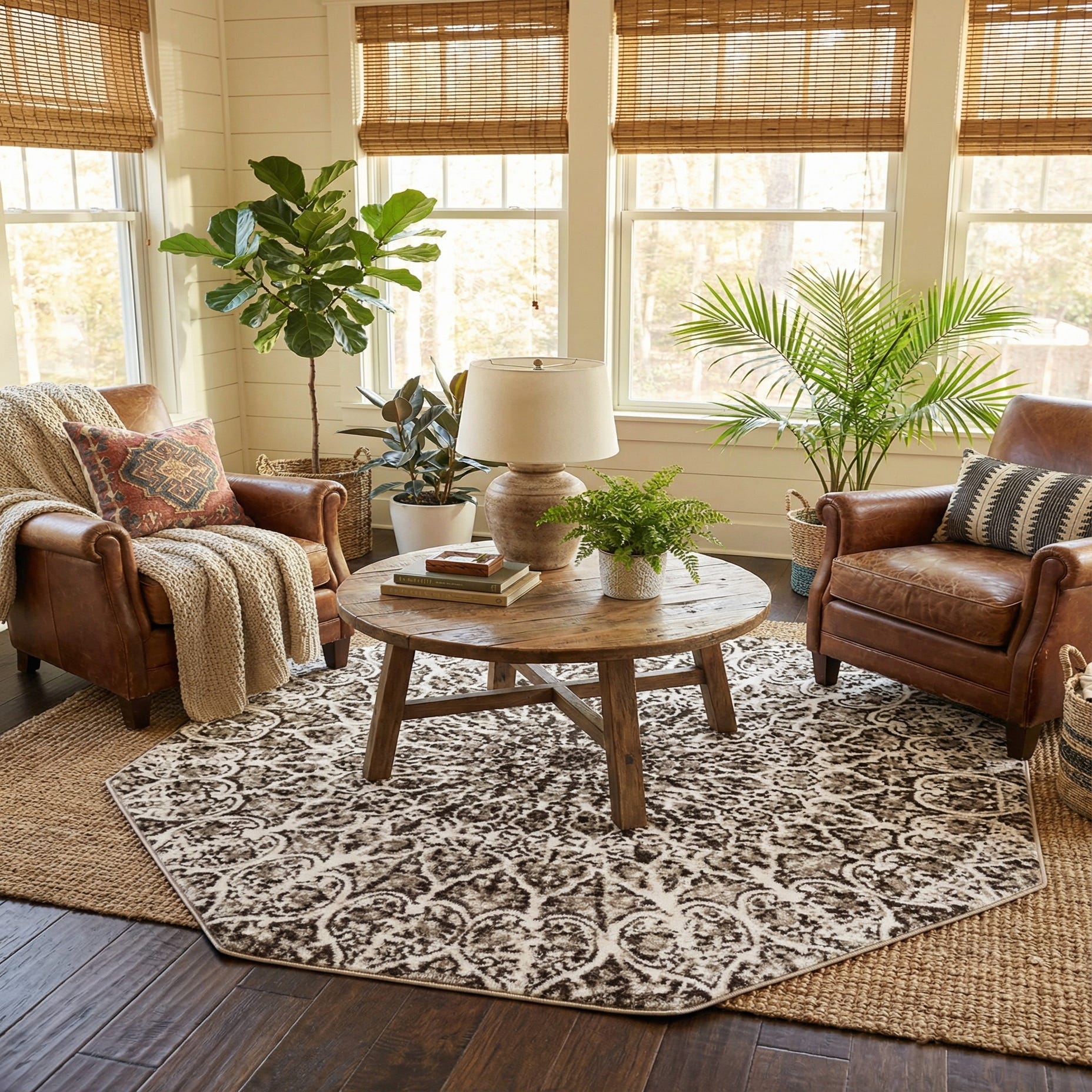 The octagonal silhouette makes this piece a natural focal point—place it beneath a round dining table, anchor a conversational grouping in a living room, or set it in an entry or foyer to welcome guests. Its brown-and-ivory palette pairs easily with warm wood tones, leather seating, and neutral linens, and it works well in transitional, traditional, or rustic interiors where an elegant yet grounded pattern is desired.
