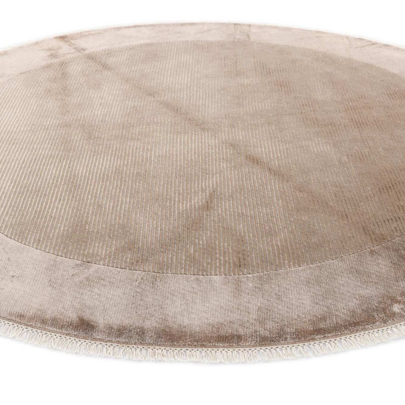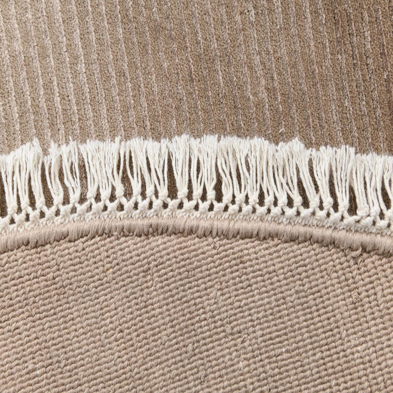 A 6' 6 x 6' 6 round brown wool rug with a subtle striped modern oriental pattern and white fringe.