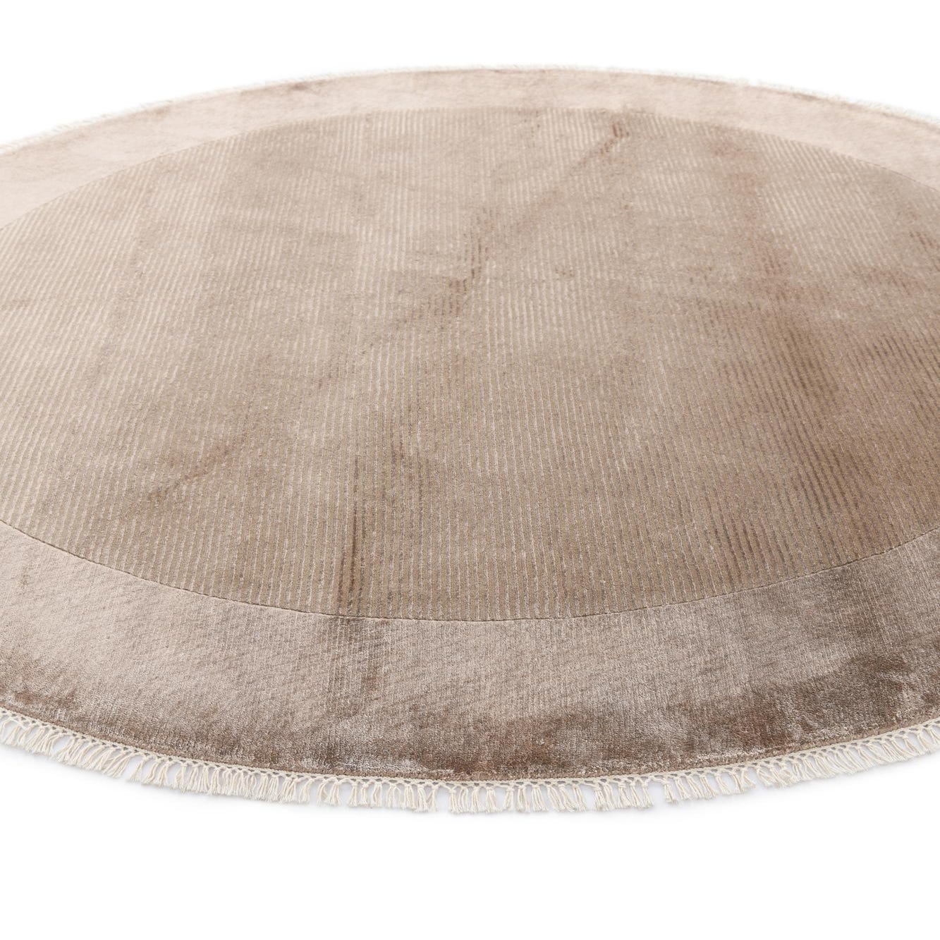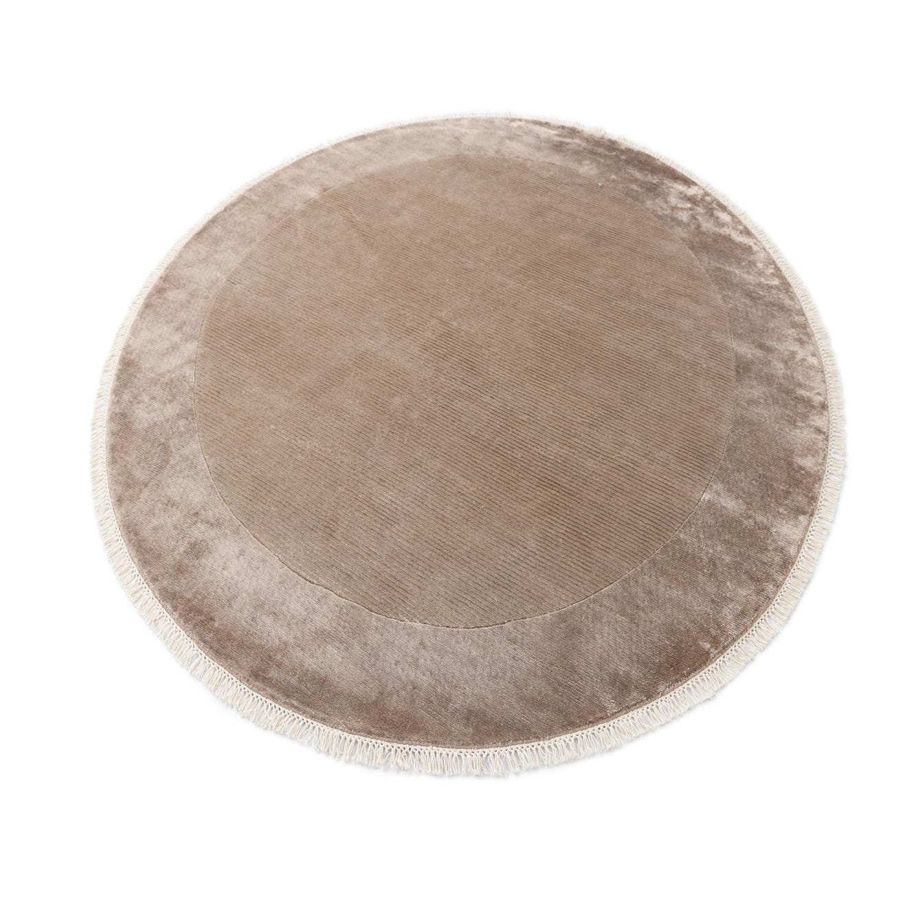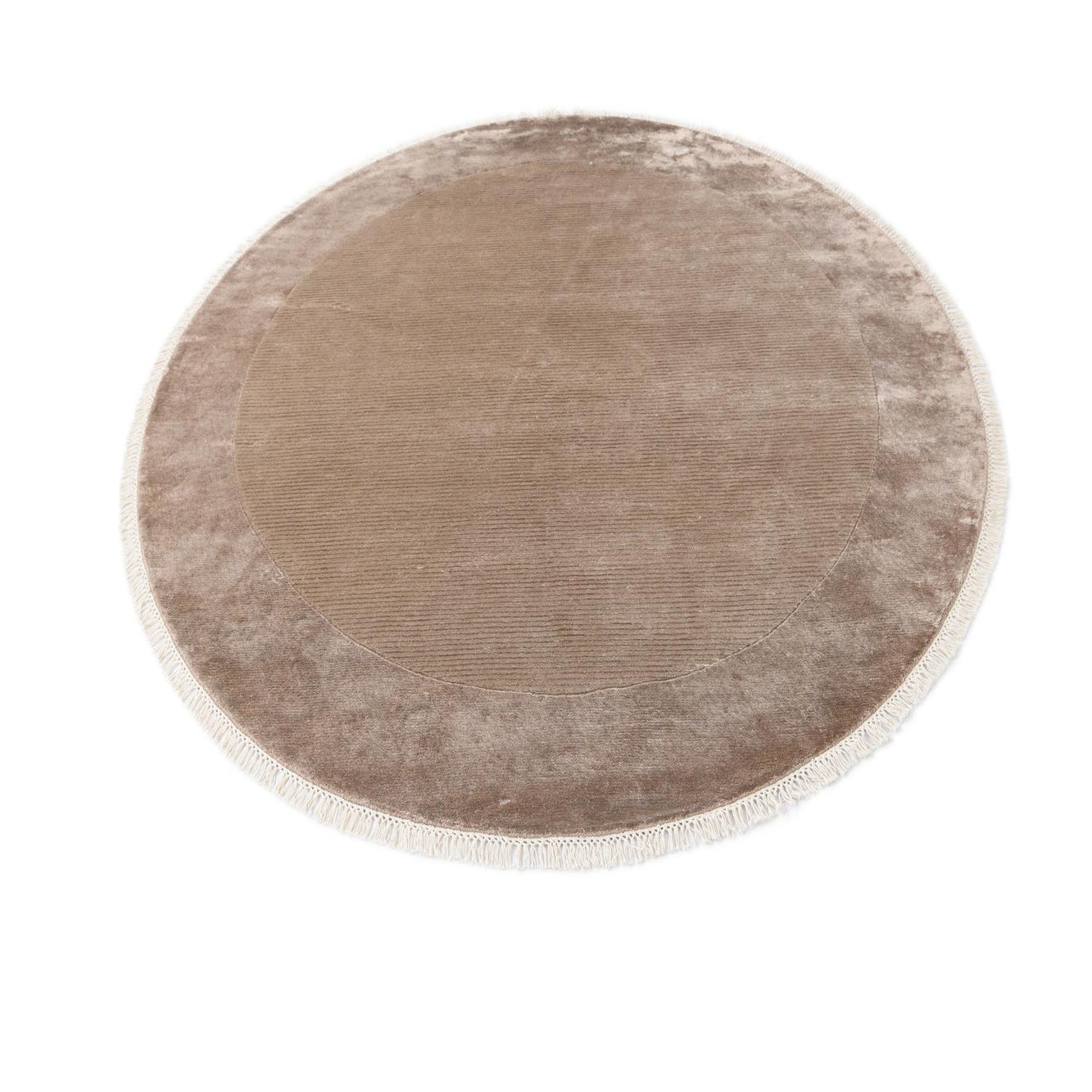 A 6' 6" round Darya rug in shades of brown and tan, featuring a subtle modern oriental pattern and fringe.