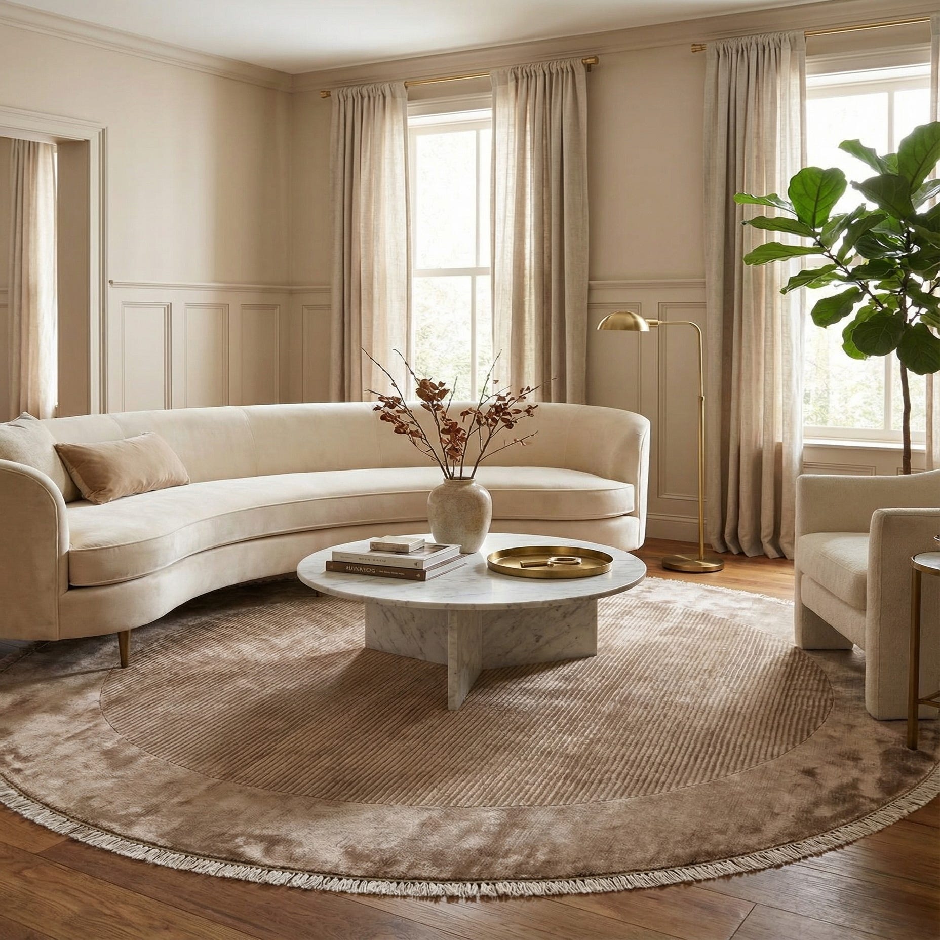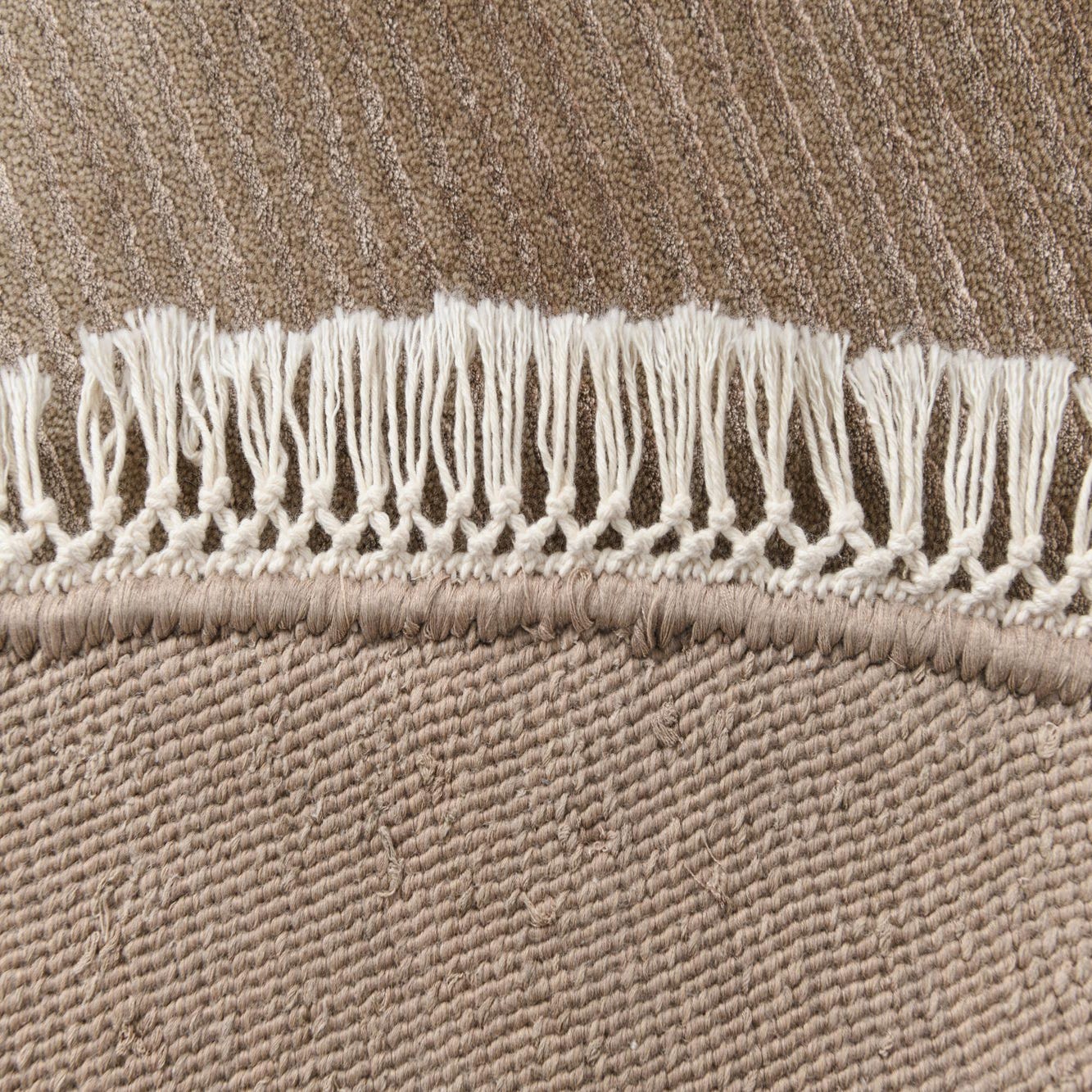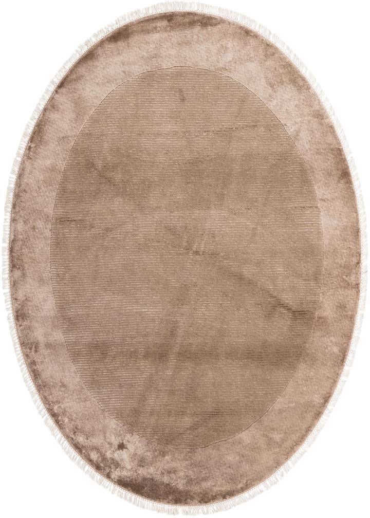 A 6' 6" round Darya rug in shades of brown and tan, featuring a subtle modern oriental pattern and fringe.