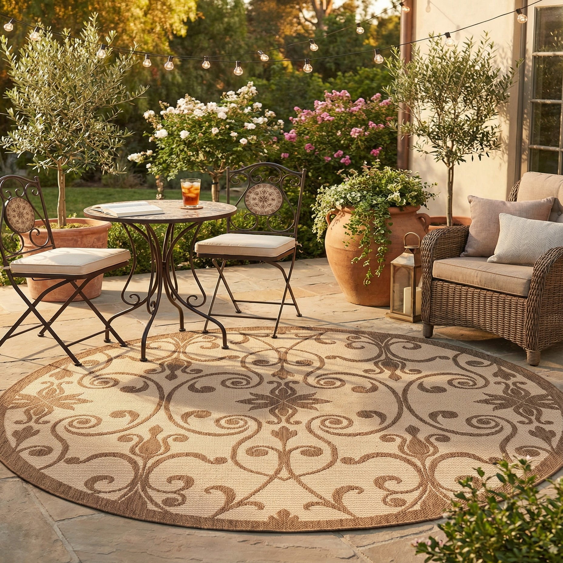 This rug works well layered beneath a small dining or bistro set, anchoring a covered porch or sunroom, or placed in an entryway to introduce warm, neutral tones. It pairs naturally with rattan or wicker seating, warm wood furniture, and linen or cotton textiles, and complements both rustic and transitional interiors where subtle patterning is desired.