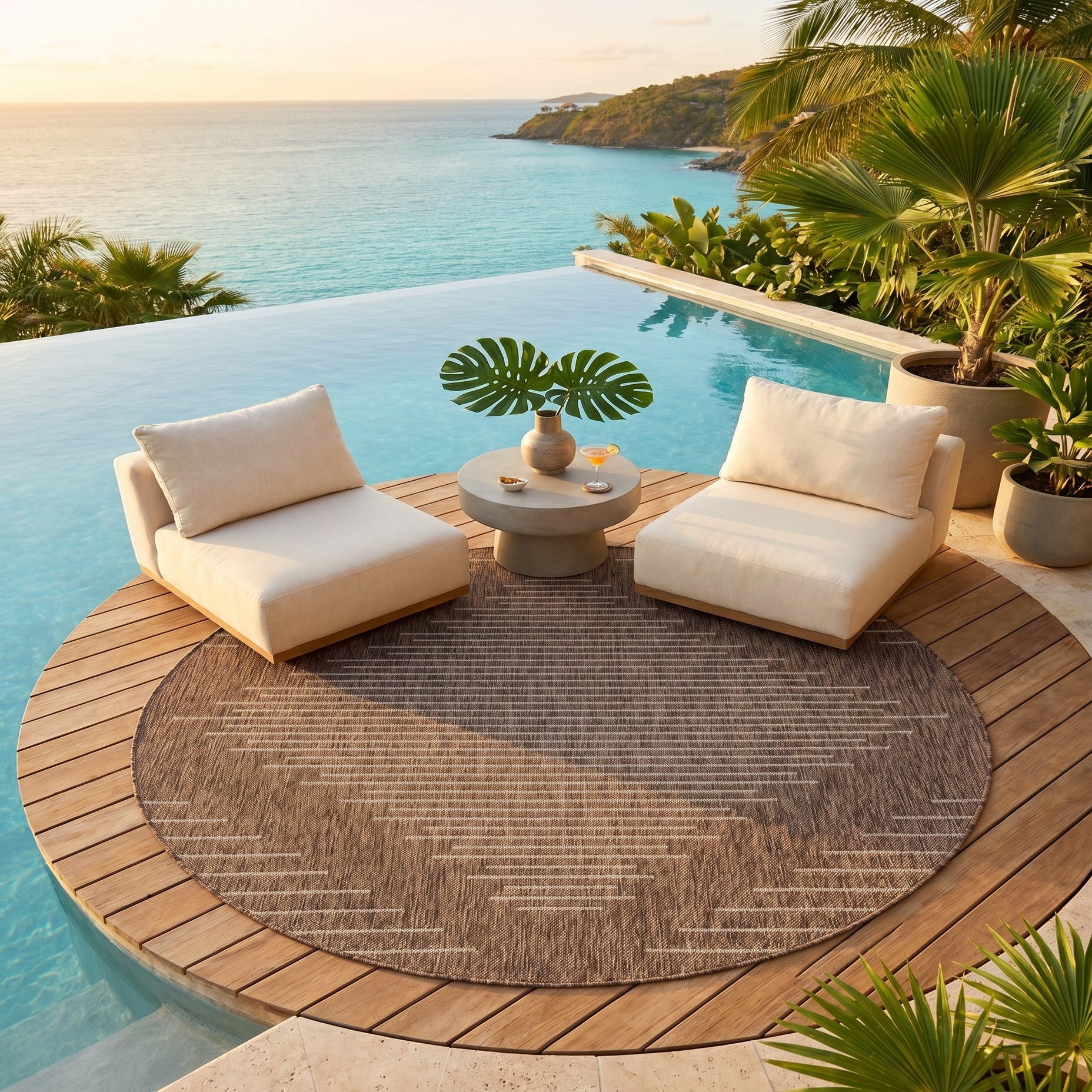 Love the contemporary look of this rug! We are so happy we chose this to accent the blue of our pool with our living area on our lanai. We still are going to add a few more pillows but love the rug to add color.