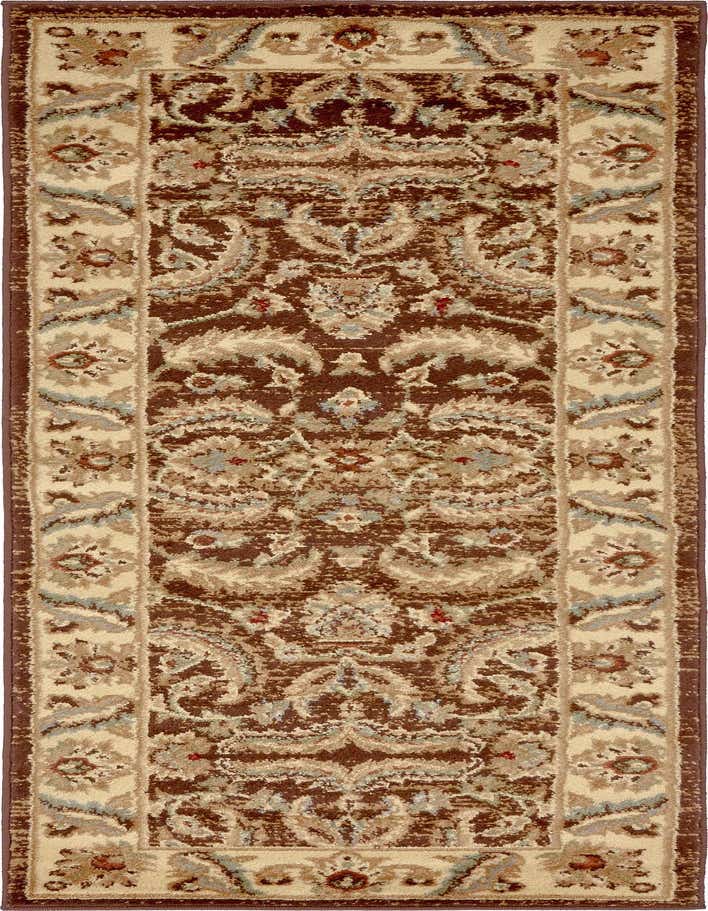 The Aditi collection runner rug is a harmonious blend of traditional design and contemporary machine-woven craftsmanship. Its rich brown background sets the stage for an intricate array of patterns, featuring a symphony of colors including candy, cream, green, light blue, tan, rust red, and red. The time-honored ornamental design displays a central medallion flanked by florals and scrollwork, creating a sense of elegance and symmetry.