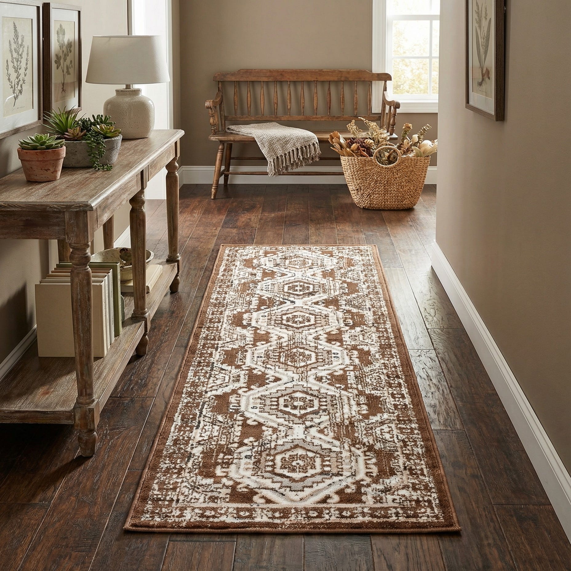 A warm brown field anchors a series of geometric medallions that run the length of this runner, with ivory and beige outlines bringing the motifs into crisp relief and subtle gray accents adding depth. The design blends a traditional medallion layout with a gently distressed finish, producing a lived-in, vintage-inspired look. Machine-made of 100% polypropylene, the rug has a low-profile pile that feels soft underfoot while maintaining a defined pattern and slight texture from the woven motifs.