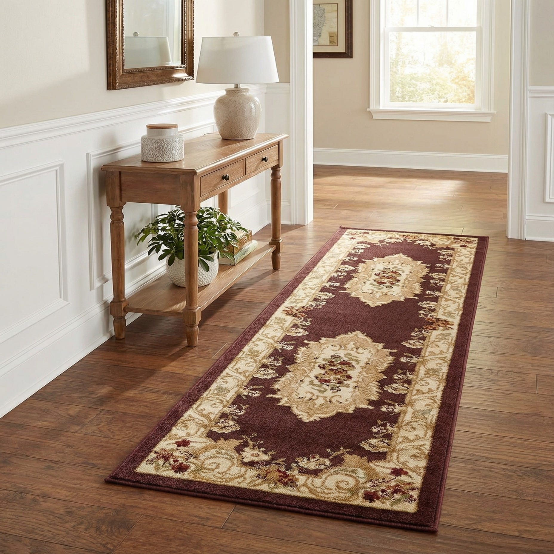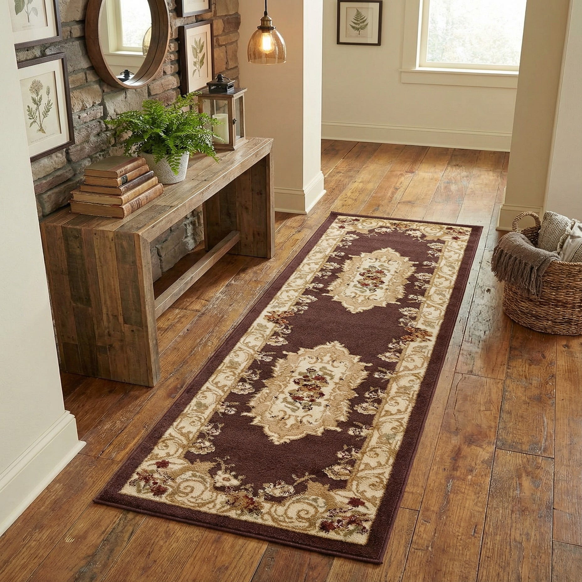 This runner works well in entry halls, long corridors, or alongside a bed where a touch of traditional warmth is needed. Pair it with dark wood furniture, upholstered seating in neutral creams or tans, and antique brass accents for a classic look, or use it to ground a vintage-inspired kitchen or formal dining entry. Its brown background and warm accent tones make it easy to coordinate with leather pieces and muted wallpapers without overpowering a room’s existing palette.