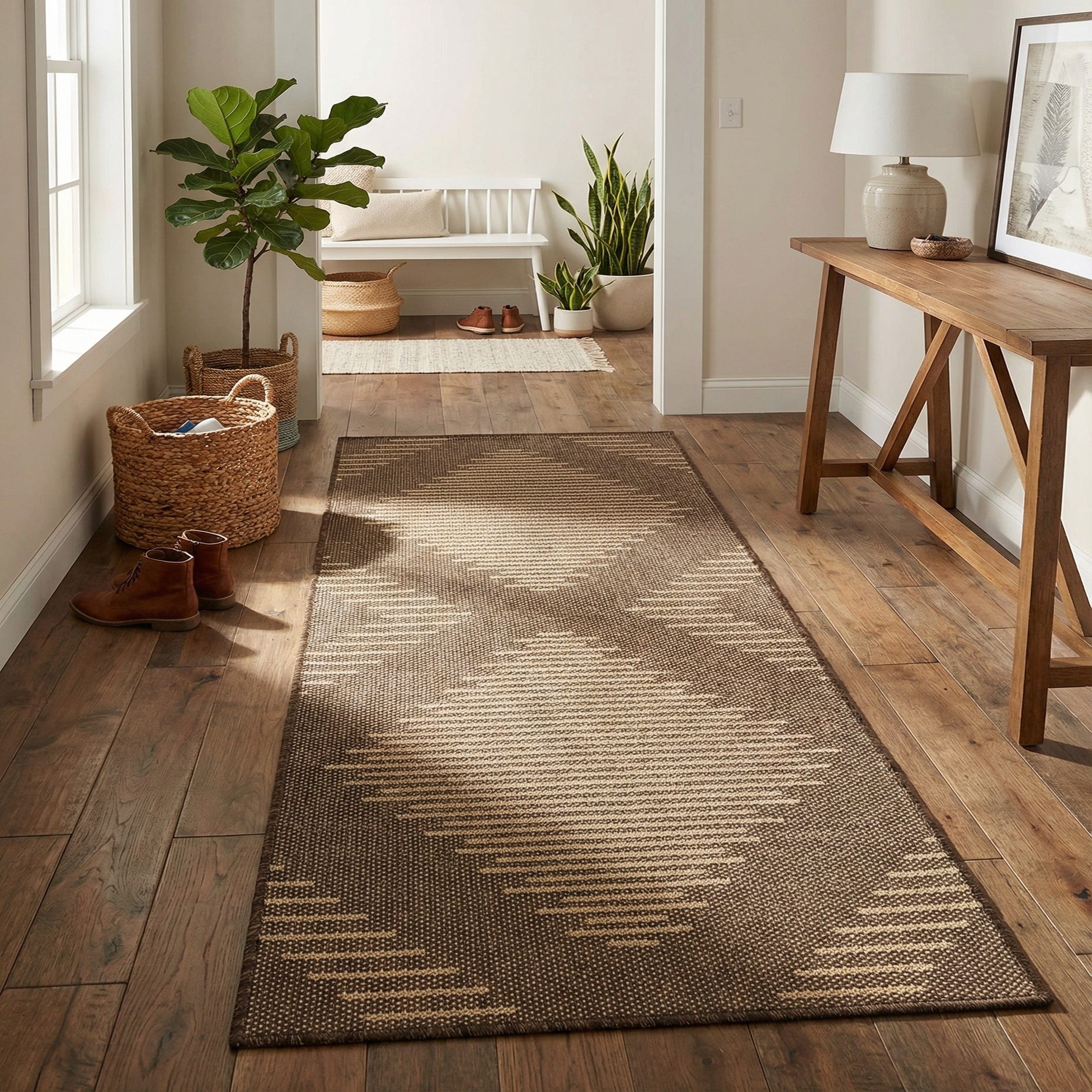 The earthy hues and contemporary design allow this runner to blend seamlessly with a range of decor styles, including modern, minimalist, or even rustic interiors. It could serve as a sophisticated corridor runner, or be placed in a kitchen to provide a durable yet stylish underfoot surface. Its simple yet effective pattern would also complement an office or study, adding warmth and texture without overwhelming the space.