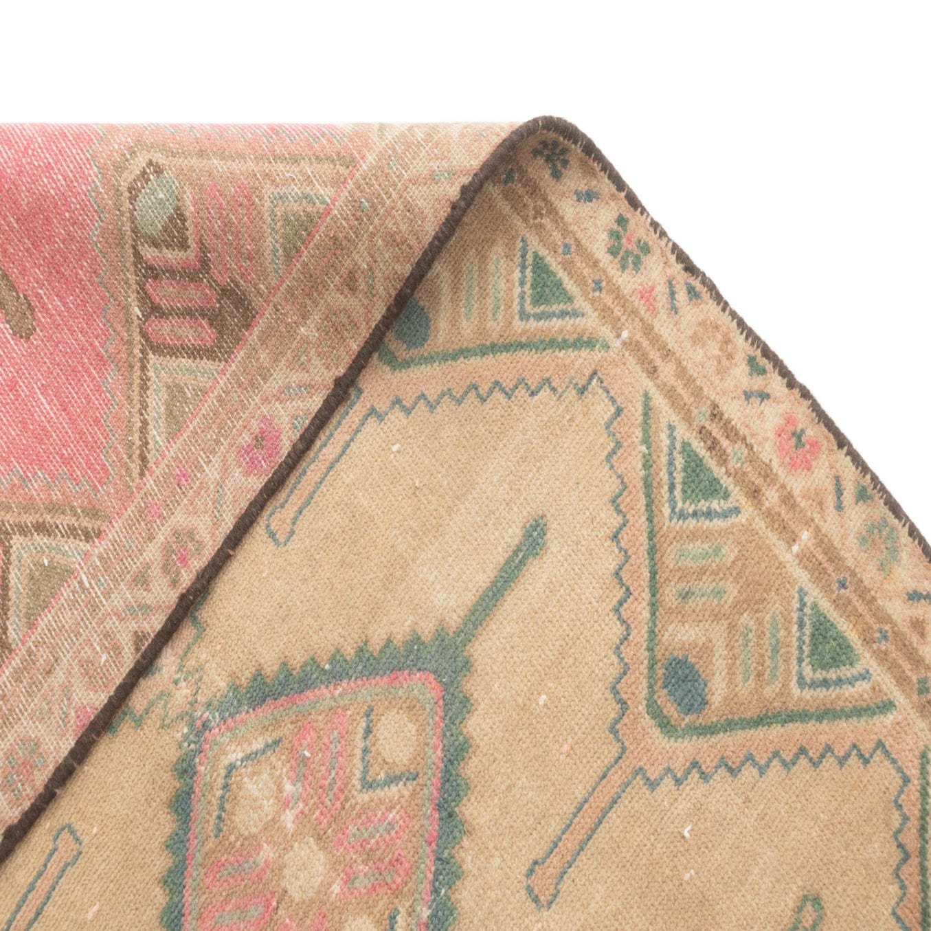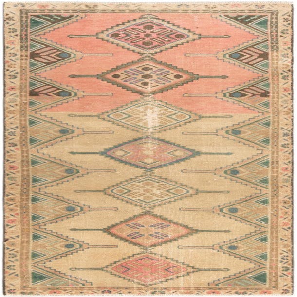 A 6 ft Hamedan runner rug featuring a tribal and traditional pattern in browns, tans, and muted pinks, ideal for a hallway.