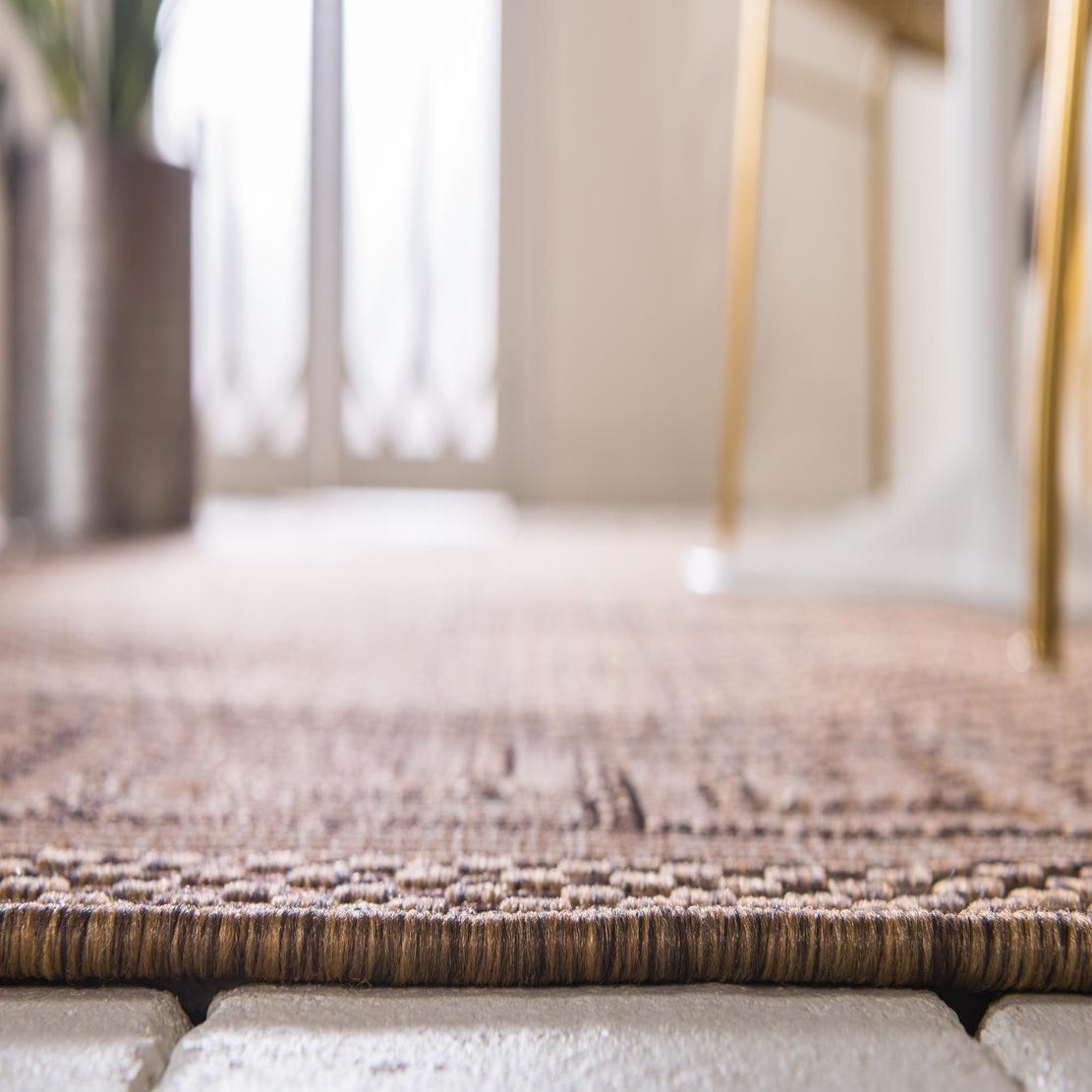 A tightly woven basketweave field in warm brown forms the heart of this runner, with light brown and gold threads interlaced to add subtle contrast and a soft, low-profile sheen. A narrow Greek-key border frames the piece, its repeating geometric motif in lighter tones creating a crisp architectural edge against the brown background. Machine-made from 100% polypropylene, the surface is firm and slightly textured underfoot, offering a flat, easy-laying profile that highlights the pattern while keeping a neat silhouette.
