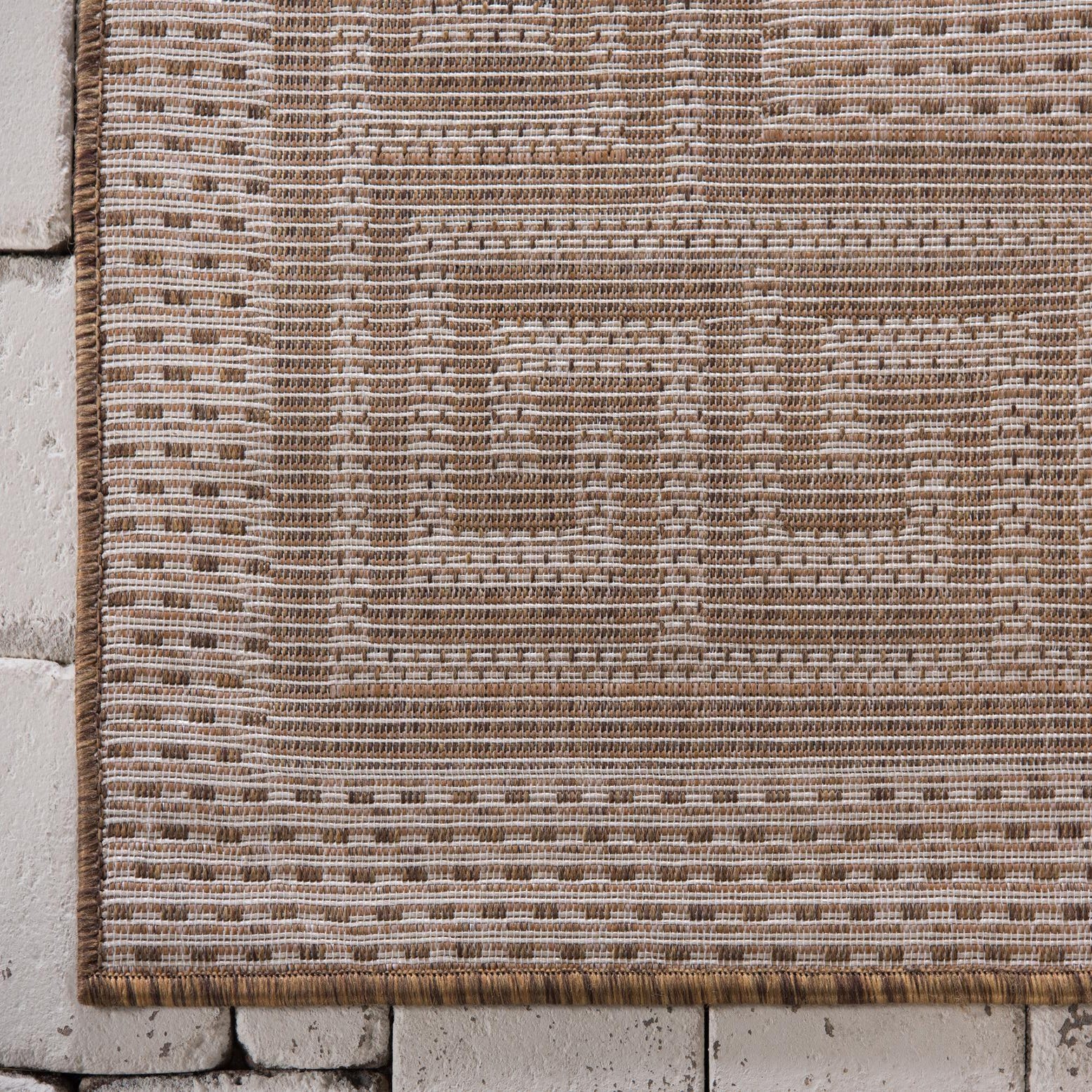 A 6 ft runner rug in shades of brown and tan, featuring a textured flatweave with a Greek key border pattern.