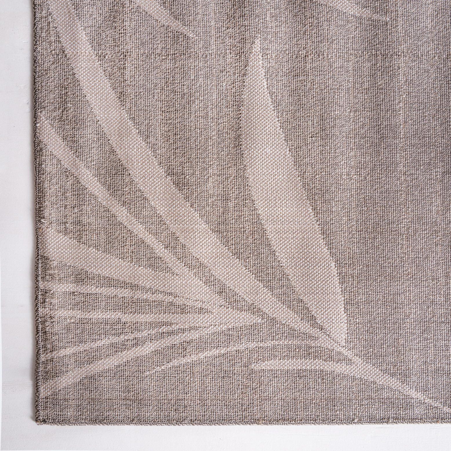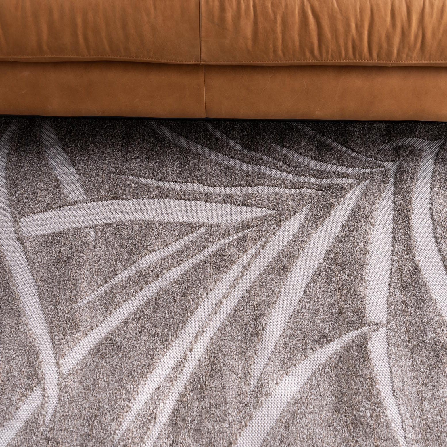 A sweeping botanical pattern of elongated leaves crosses a warm brown background, with the leaf silhouettes picked out in soft beige. The design reads as modern yet organic, offering a calm, nature-inspired rhythm that complements both contemporary and relaxed outdoor spaces. The surface has a textured, low-profile feel — the brown ground presents a slightly ribbed weave while the beige leaf areas are smoother, creating subtle contrast you can feel underfoot.