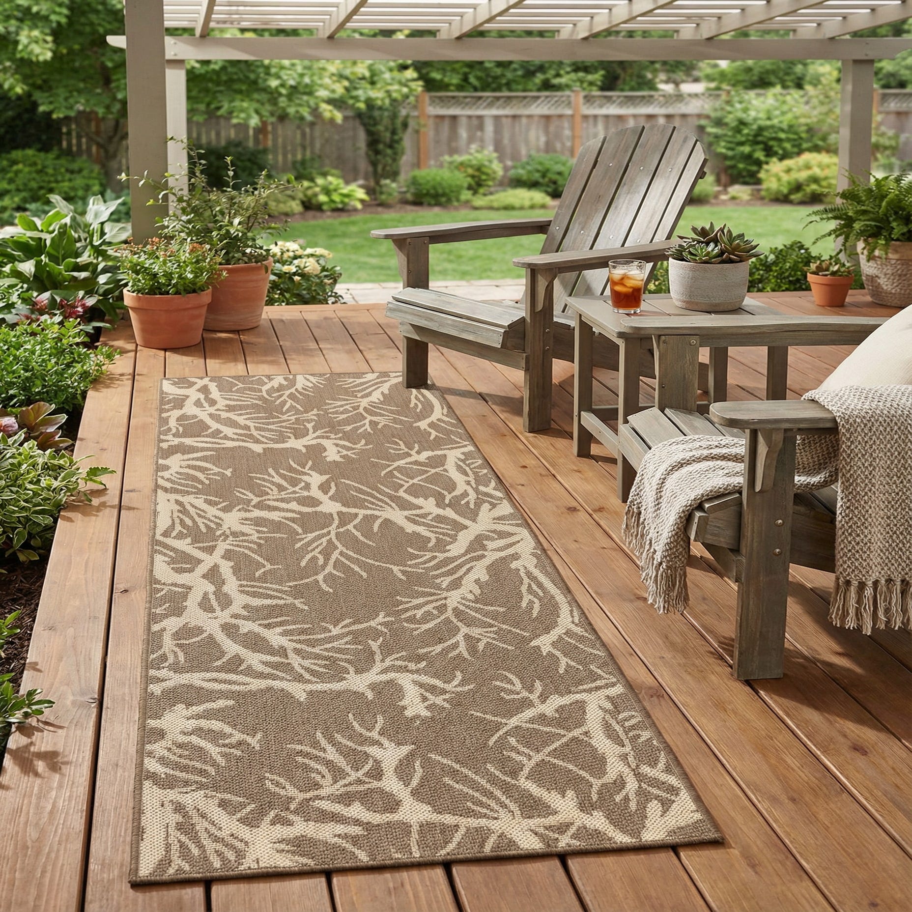 Machine made from 100% polypropylene, the rug has a low-profile, flatwoven texture with a subtle, tactile grain underfoot and a crisp woven appearance. That construction keeps the pattern defined and makes the piece well suited for entryways, hallways or a kitchen runner, as well as covered porches and sunrooms. Pair it with rattan or wicker and linen fabrics for a relaxed, coastal feel, combine with weathered wood and matte metal for a modern farmhouse look, or use alongside neutral leathers and clean-lined furniture in a contemporary transitional scheme.