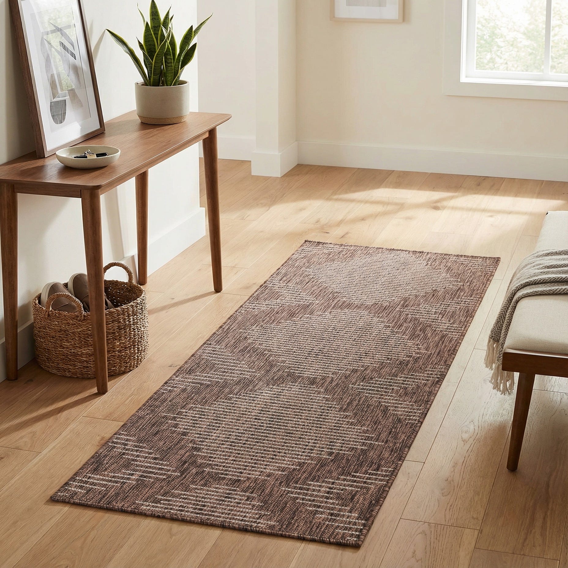 Designed for versatile placement, this runner works well in a covered porch or patio, a busy hallway, or alongside a kitchen island. Pair it with warm wood tones, leather or rattan seating, and neutral linens to highlight the brown and ivory palette, or use it to ground metal-framed furniture in contemporary and transitional settings. Machine made of 100% polypropylene, this piece provides a practical, stylish layer that complements both indoor and outdoor-inspired decor.