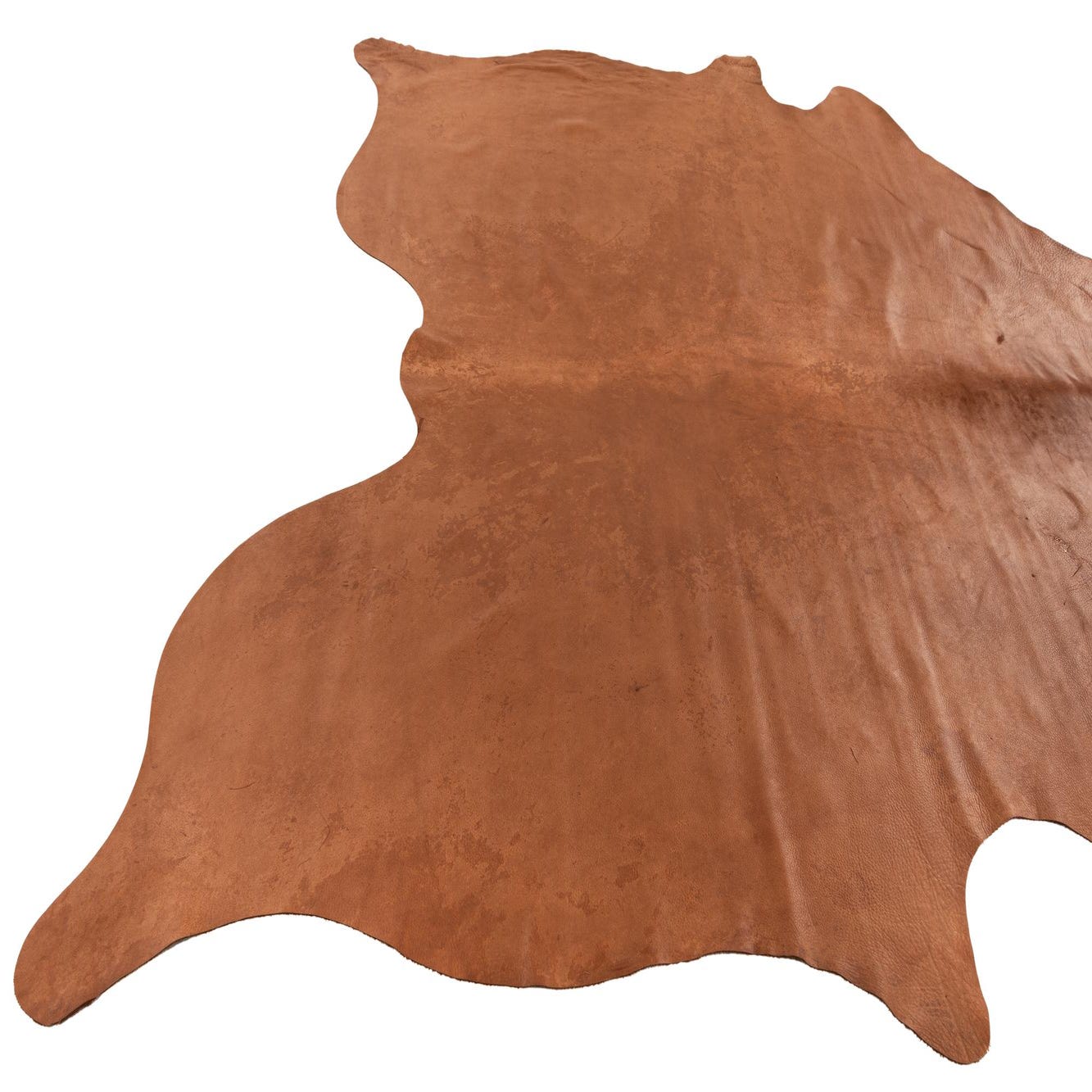 A 6' 6 x 6' 11 square brown cowhide leather rug with natural, irregular edges, showcasing its flat, textured pile.