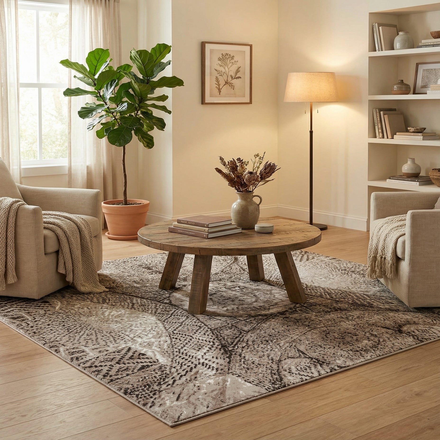 Primary color is Brown. Colors in this rug include: Brown, Beige, Ivory.