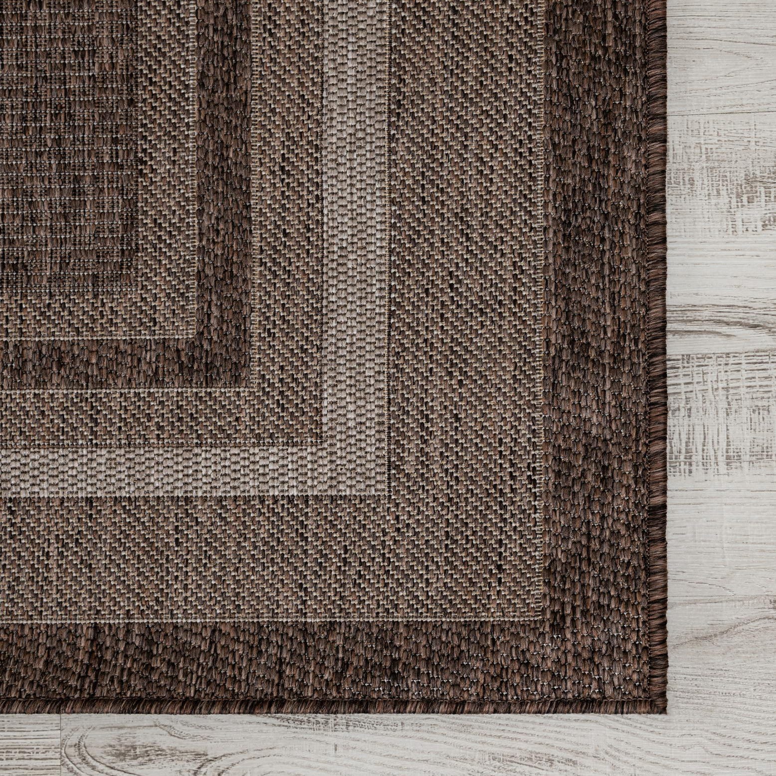 A structured border design frames a warm brown field with layered rectangular bands in beige and deeper brown, creating a clean, architectural look. The pattern is flat-woven with a tight grid weave across the center and stepped border lines that add visual depth without heavy ornamentation. Made from 100% polypropylene, the surface has a low-profile, slightly textured hand that echoes natural woven fibers while keeping a crisp, tailored appearance.