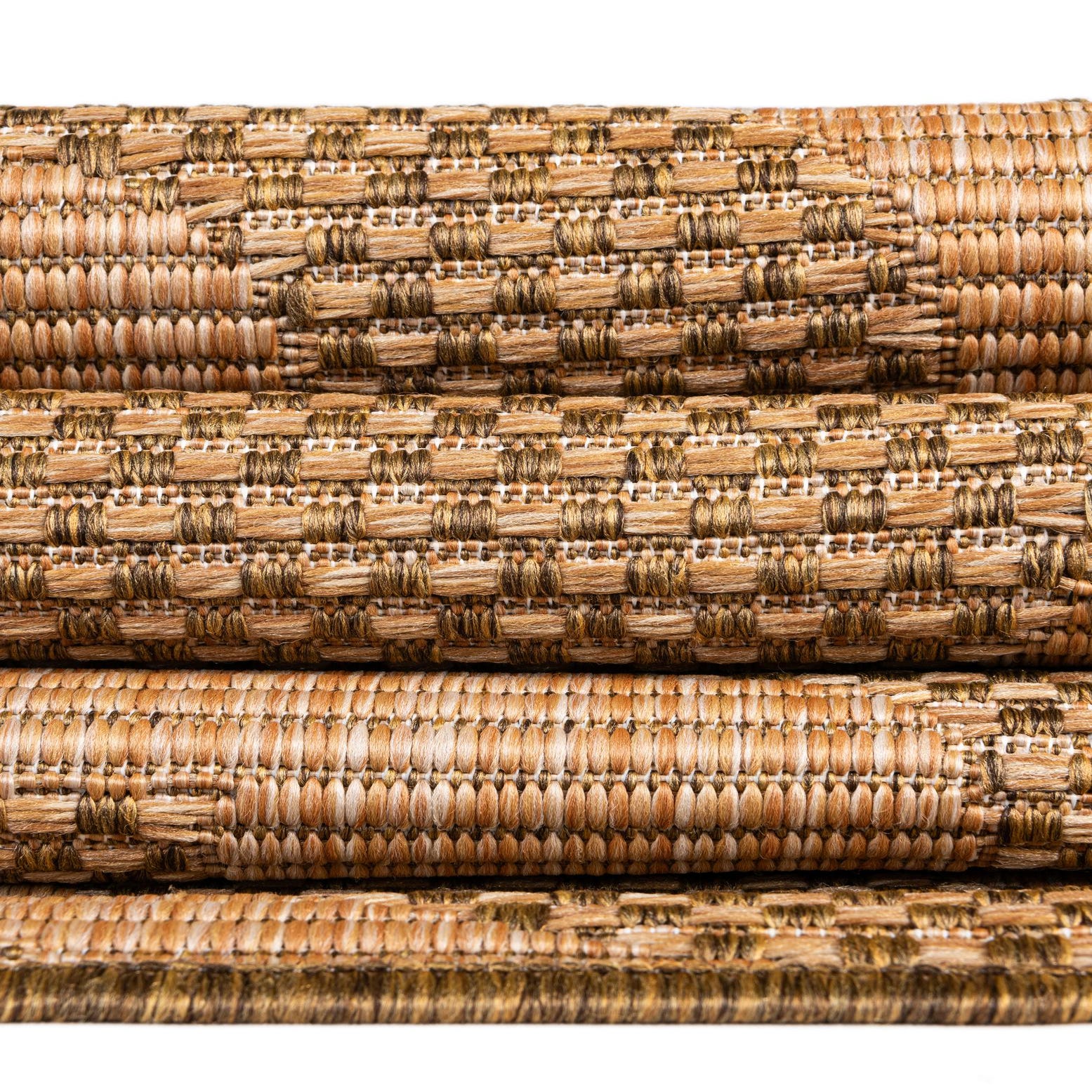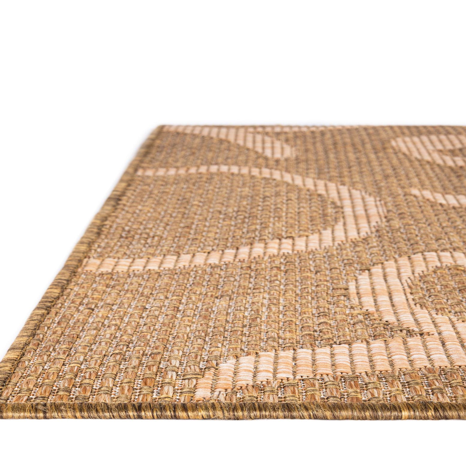 A warm brown, tightly woven ground forms the foundation for a gentle botanical scroll pattern in soft beige. The stylized vines and curving leaves float across a textured basketweave surface, giving the rug visual depth without a high pile. Machine made from 100% polypropylene, the construction yields a low-profile, slightly textured hand that feels firm underfoot and holds its woven detail.