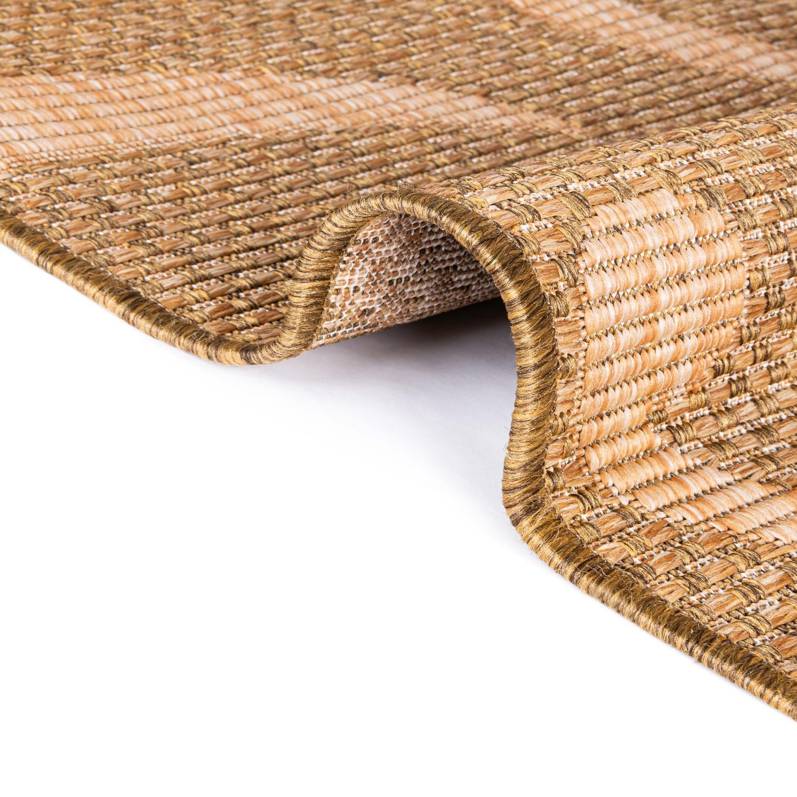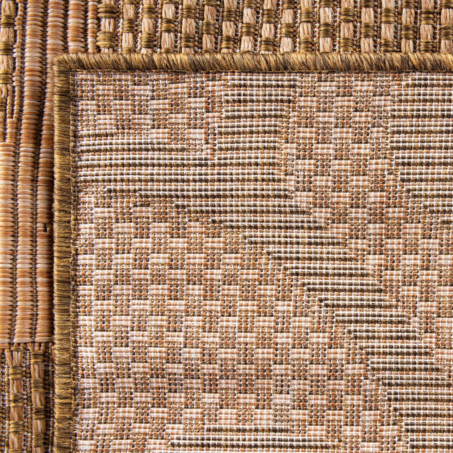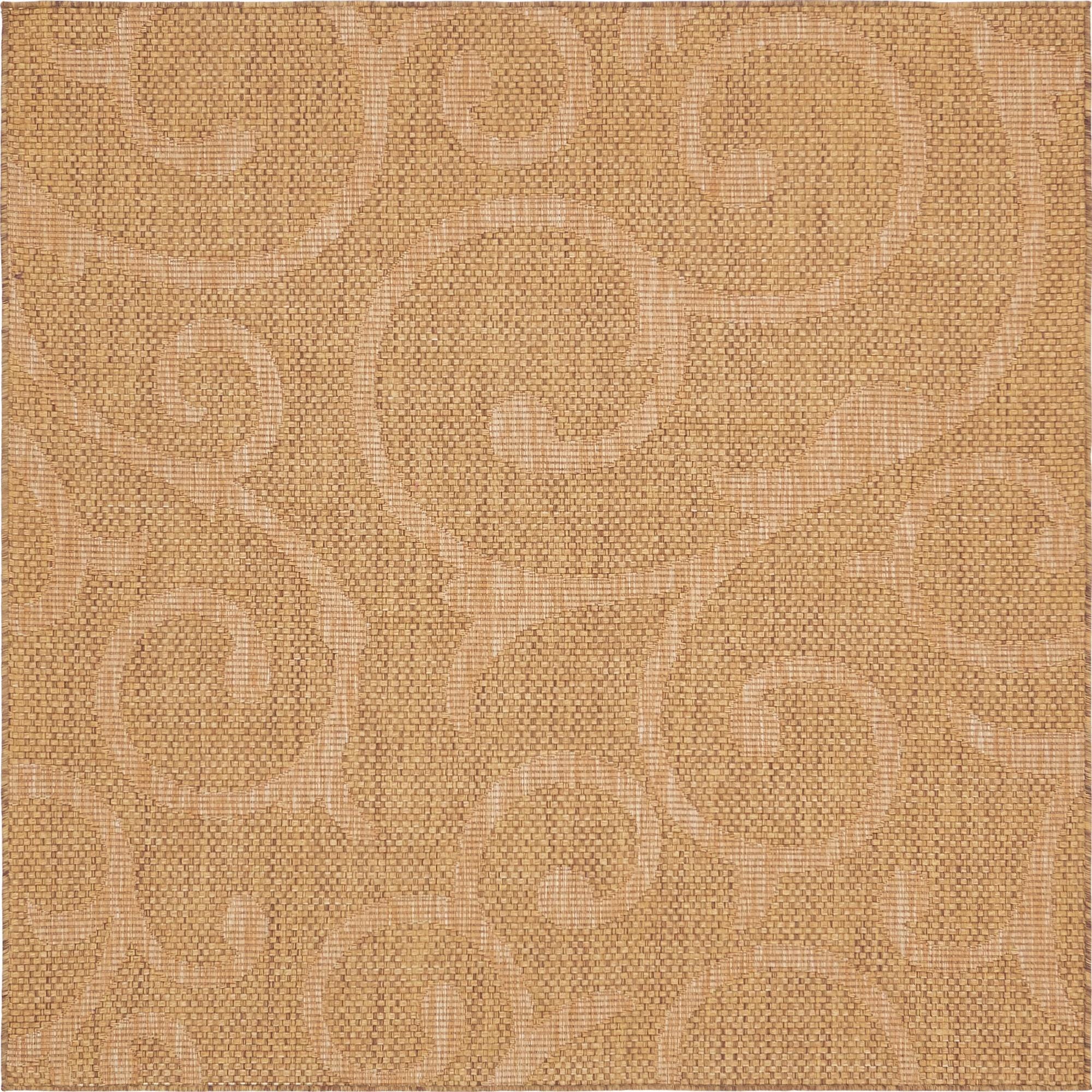 A 6'x6' square brown indoor/outdoor rug with a subtle, textured botanical pattern, ideal for a patio.