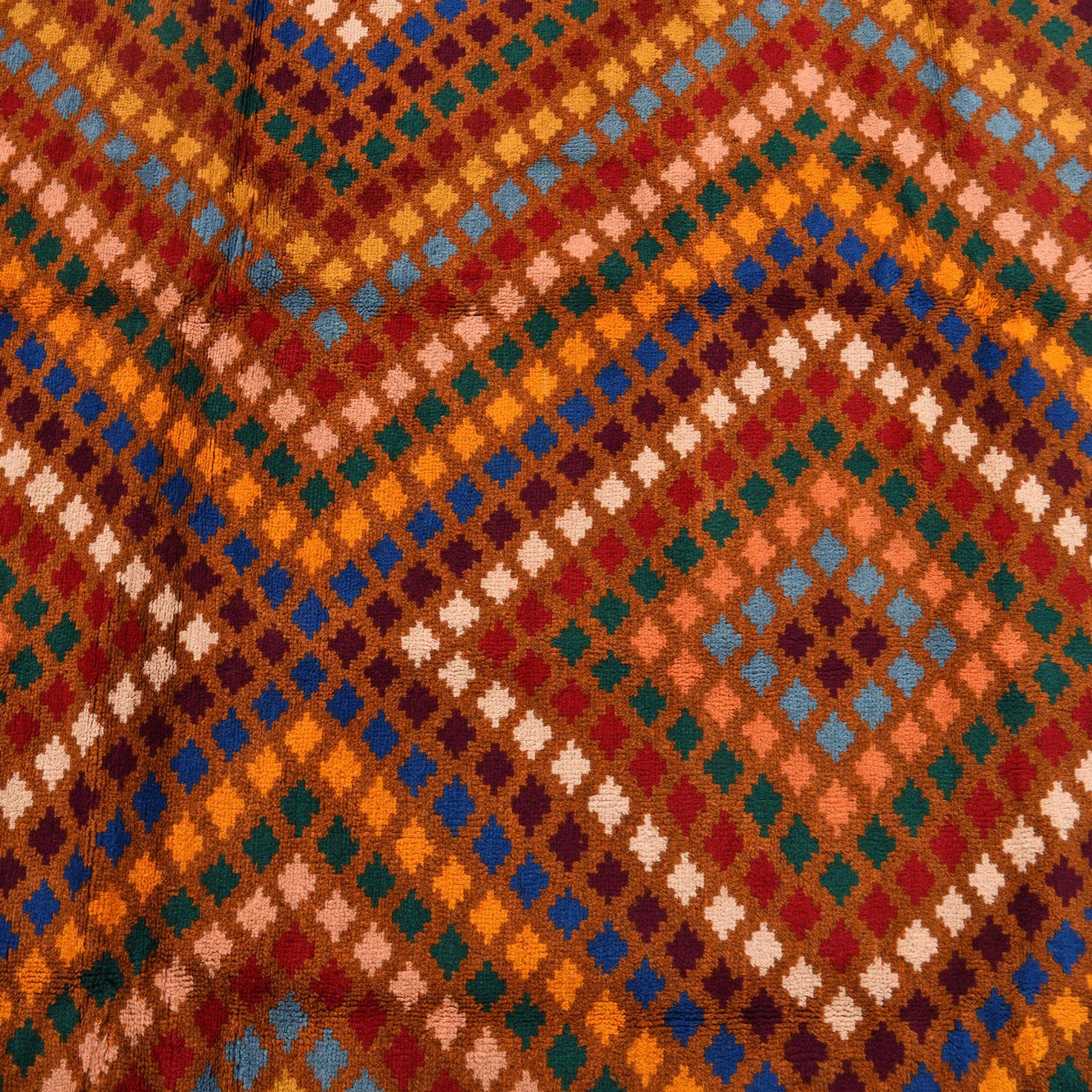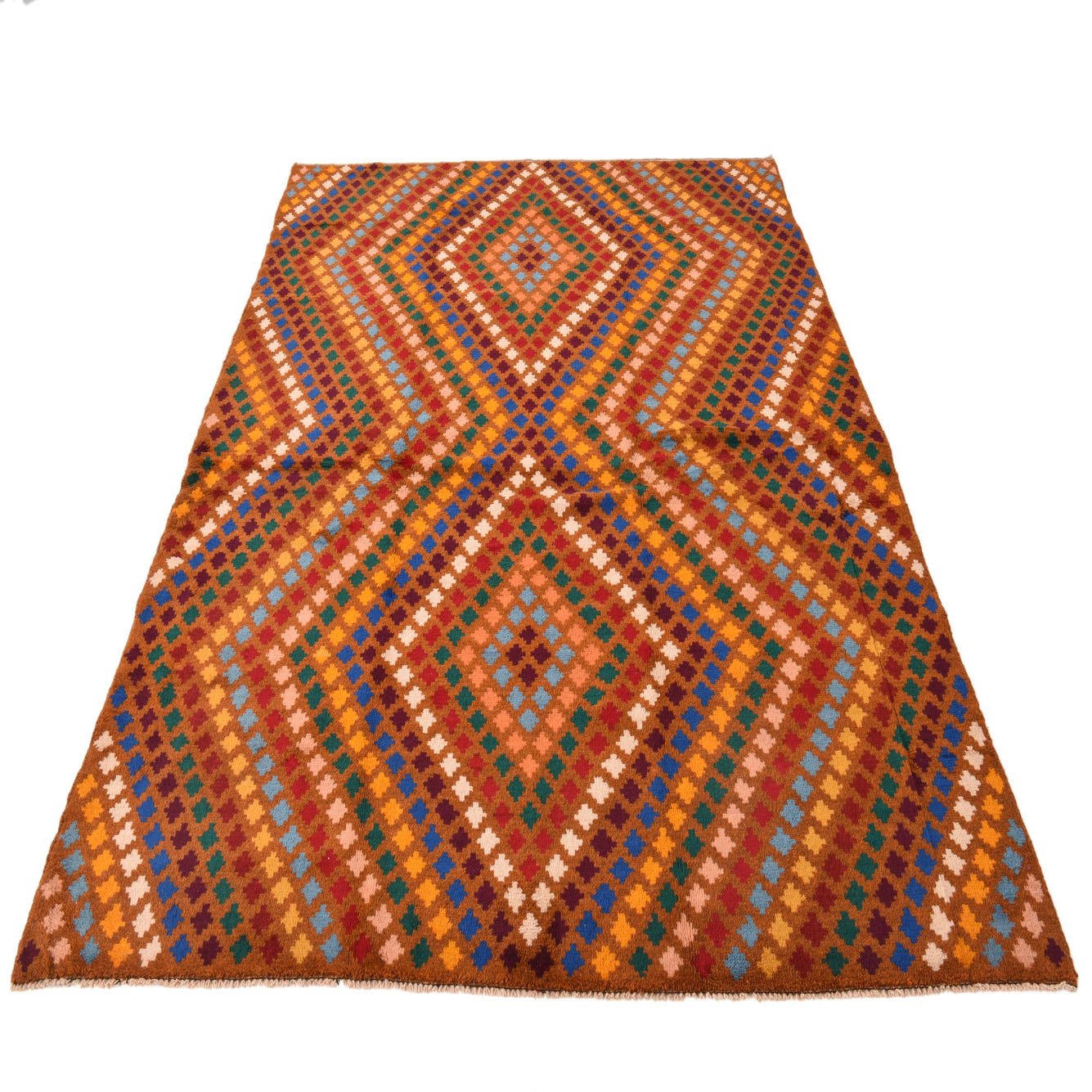 A 6x9 rectangular Balouch rug with a tribal, modern pattern in shades of brown, tan, red, blue, green, and orange, featuring a repeating diamond motif.