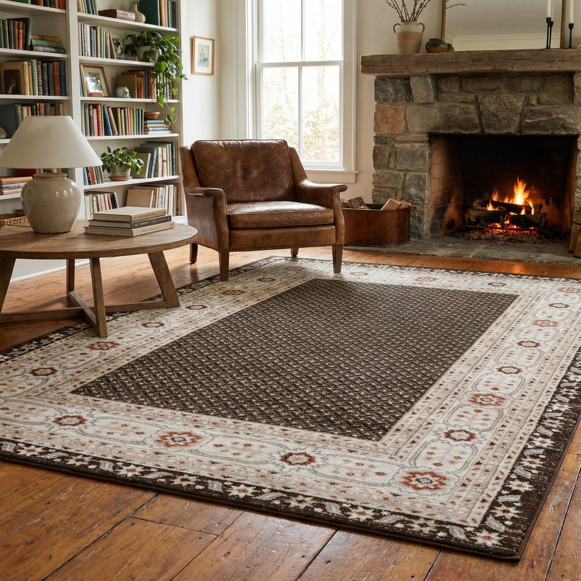 Primary color is Brown. Colors in this rug include: Brown, Gray, Ivory, Rust Red.