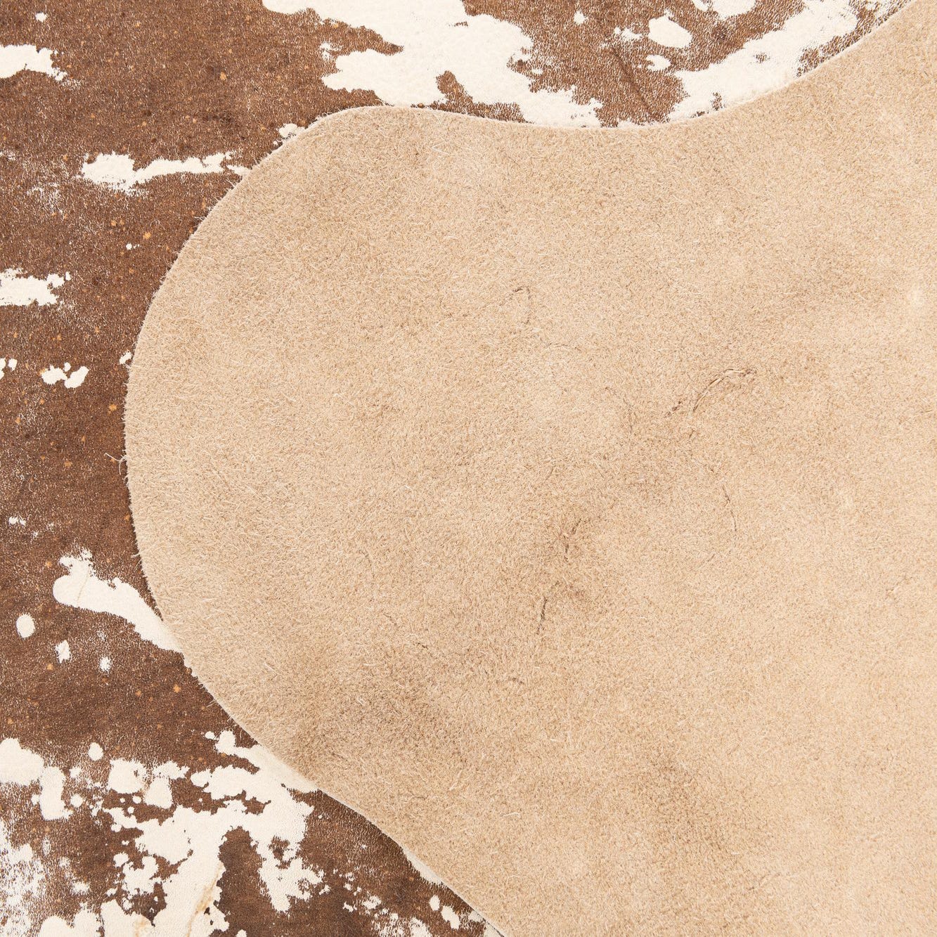 A distinctive cowhide with a rich brown background interrupted by irregular cream markings, this rug shows an organic, asymmetrical pattern that reads both natural and graphic. The hide’s edges keep the original silhouette, and the mottled cream splashes create movement across the surface. Running your hand over it, you feel a low, velvety hair-on-hide nap with a smooth leather underside—hand made of cowhide and leather, built to highlight the material’s natural texture and variation.