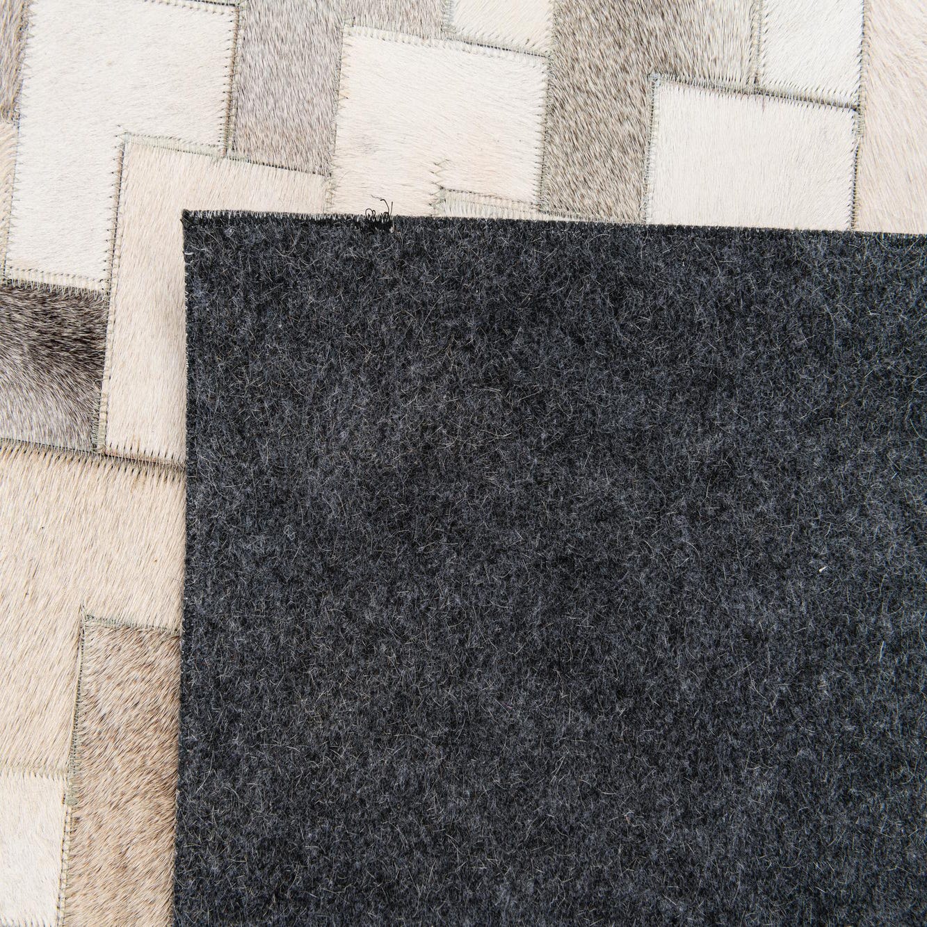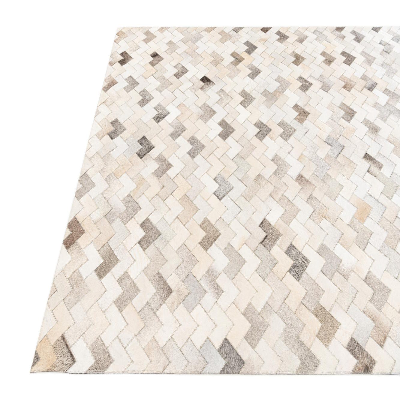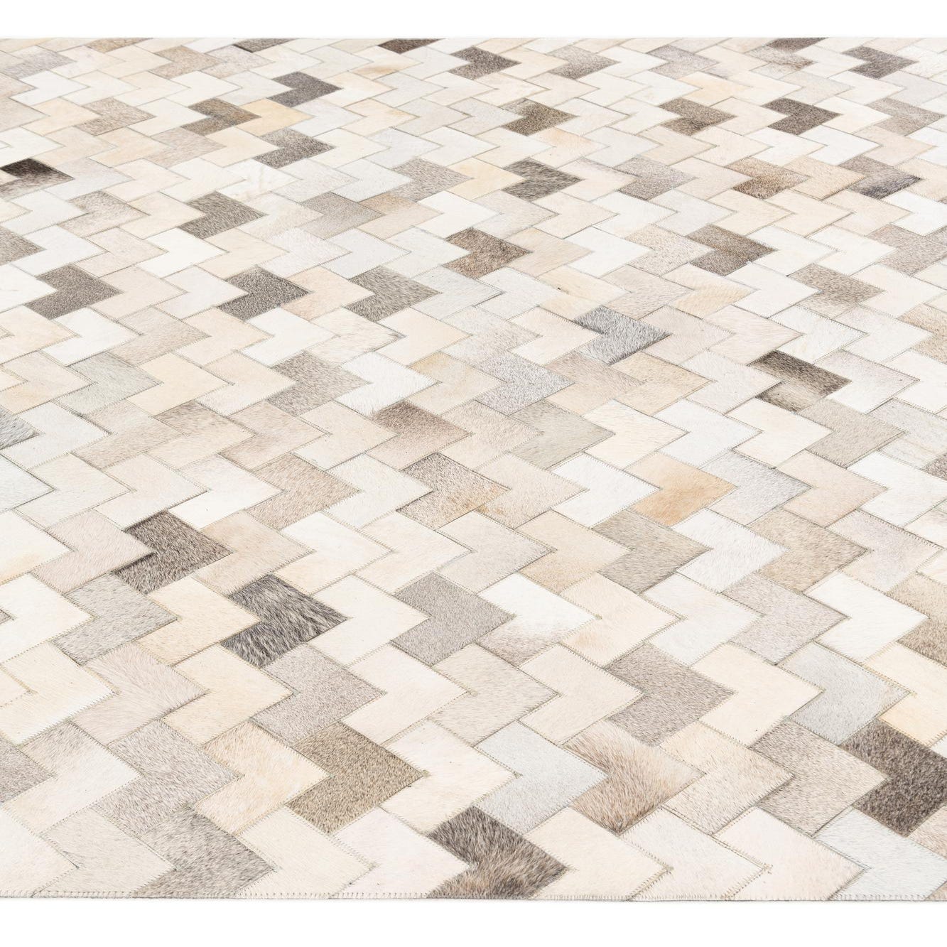 Hand made of cowhide and leather, this rug presents a tightly stitched chevron patchwork that reads like a mosaic of small V-shaped tiles. The brown background anchors a palette of beige, ivory, light brown, gray and occasional black accents, with each hide tile showing natural variation in tone and hair direction. Running your hand across the surface reveals the subtle nap and low-sheen texture of hair-on-hide, while the stitched seams add a tactile, crafted quality that gives the rug depth without added pile.
