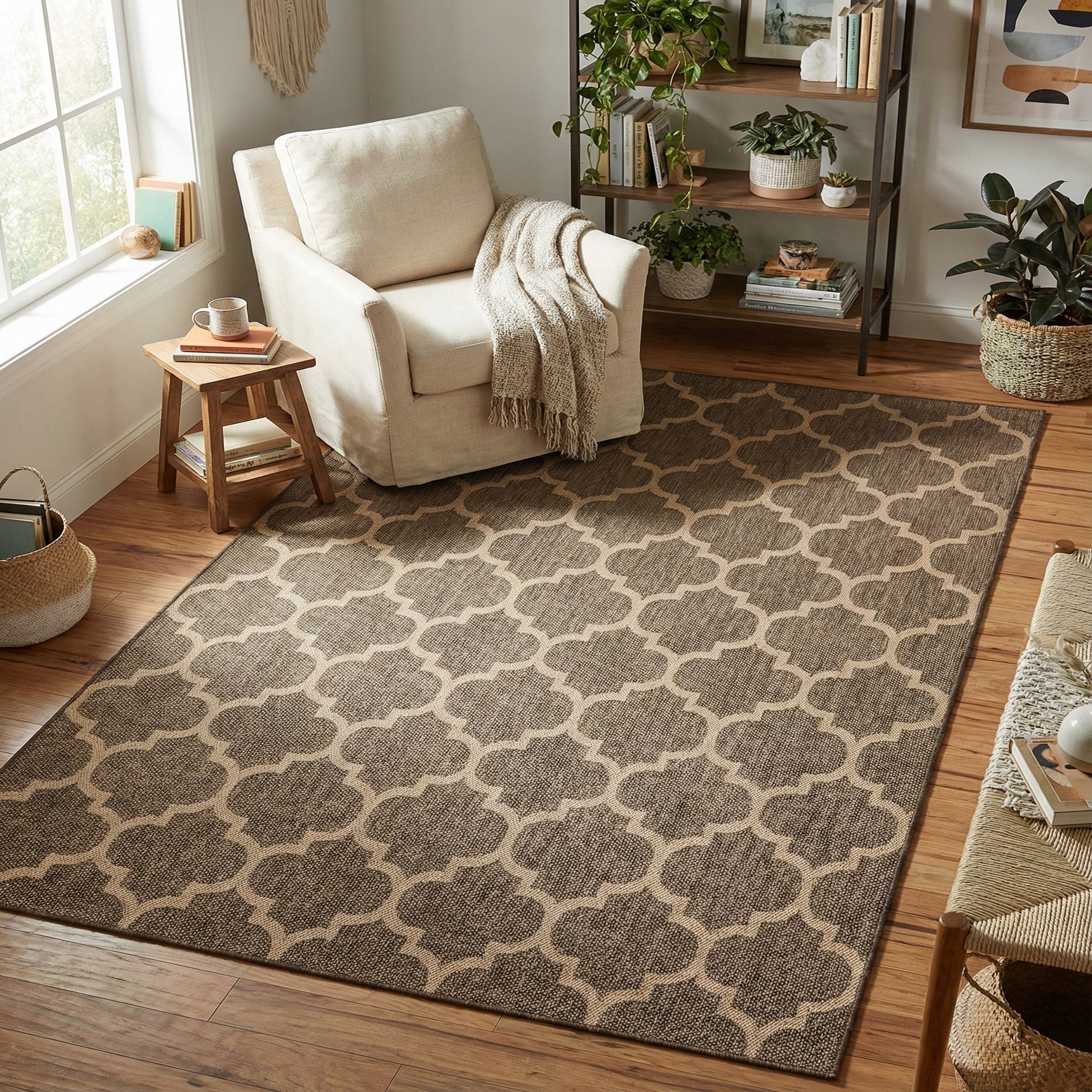 The Dunes collection presents a 6x9 rug that is machine woven of polypropylene, offering a combination of durability and style. This rug displays a lattice pattern accentuated with contrasting brown and natural colors, set against a predominant brown background. The flatweave construction contributes to the rug's sleek profile and ease of integration into various spaces.