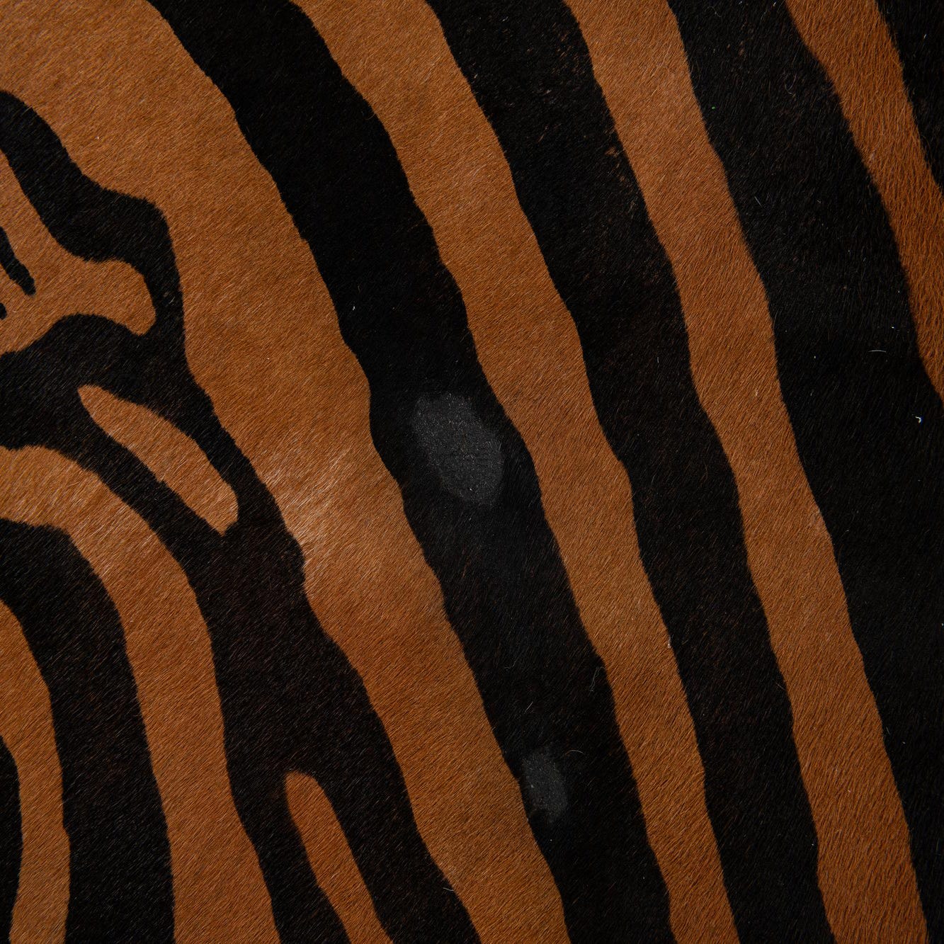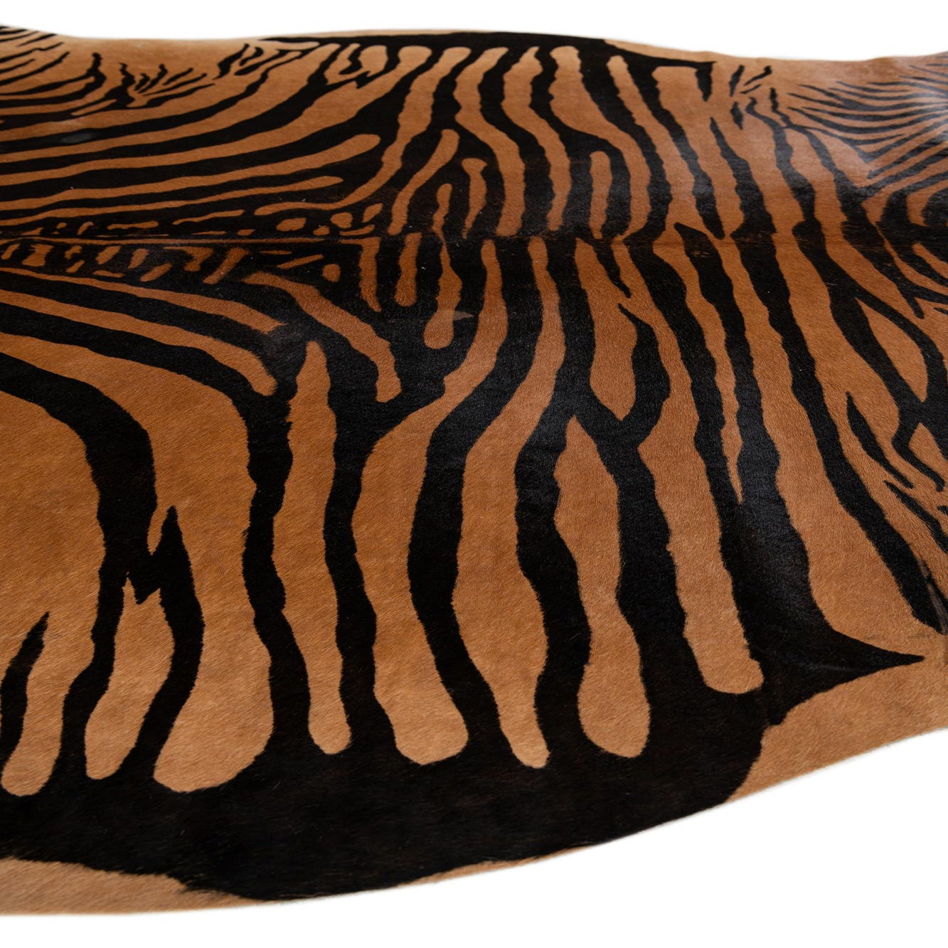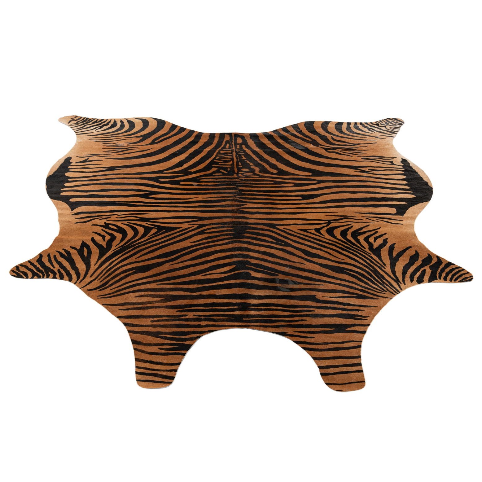 A 6'5" x 7'0" freeform cowhide rug with a modern brown and black zebra stripe pattern.