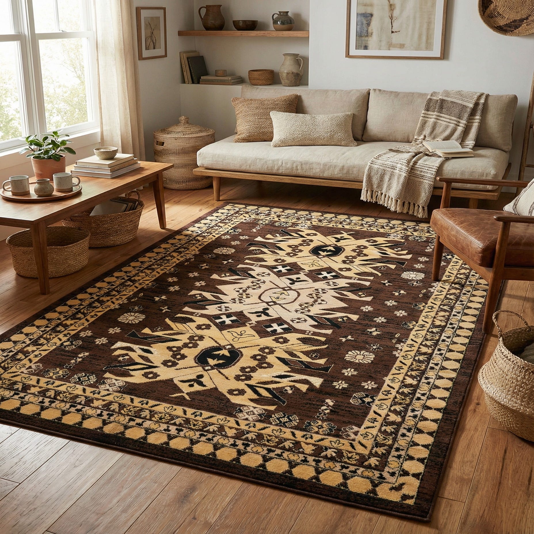 This rug works well as an anchor for a living room seating group or beneath a dining table, pairing naturally with warm woods, leather upholstery, and neutral textiles. It also complements transitional, rustic, or southwestern-inspired interiors and layers nicely over hardwood or tile. Use it to add pattern and grounding color to a study, entry, or family room where you want a composed, lived-in look without overwhelming other finishes.