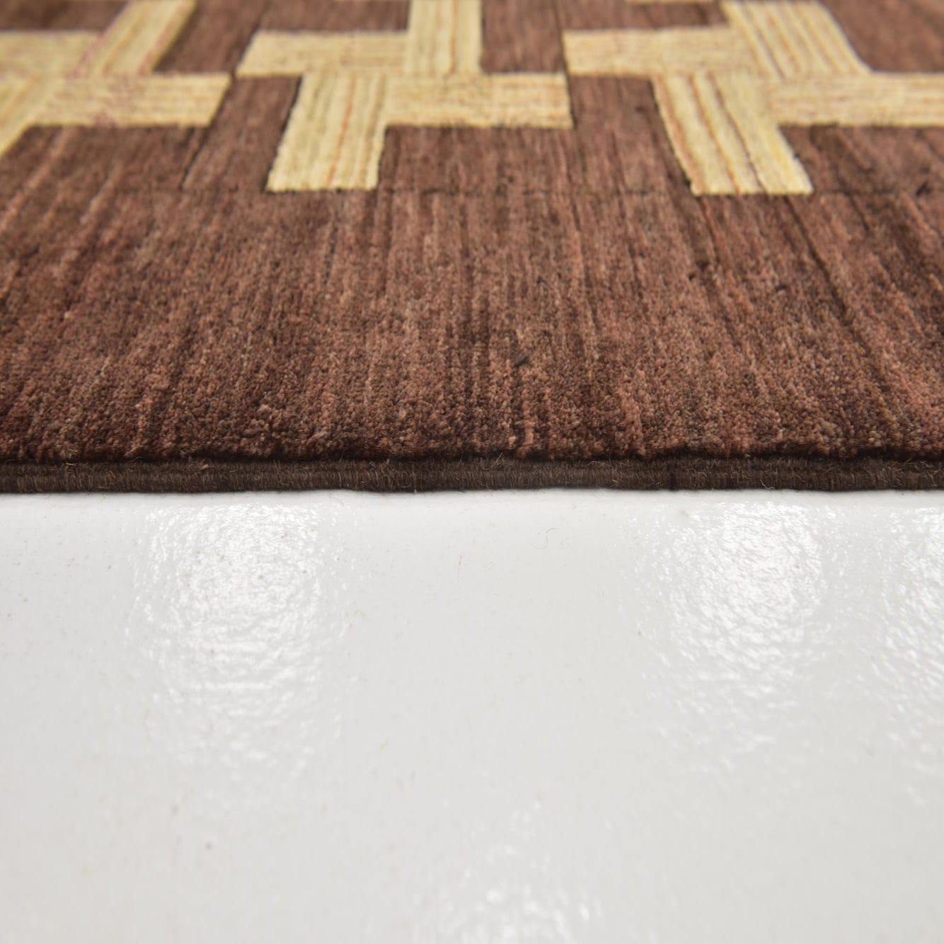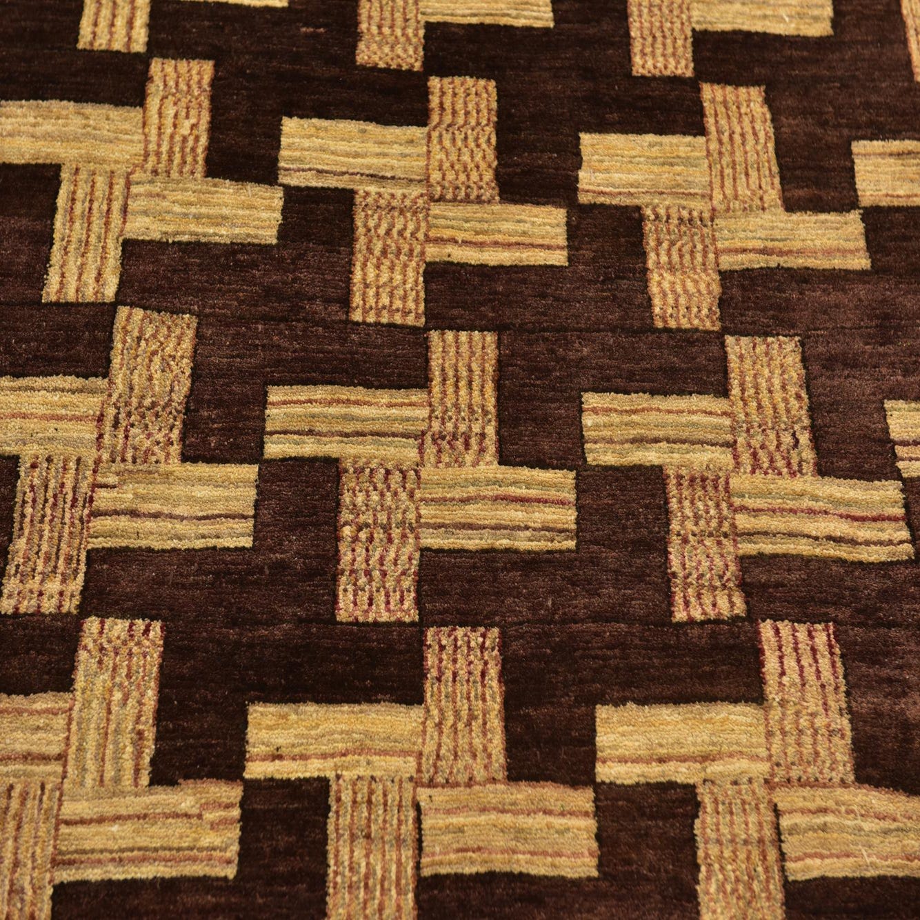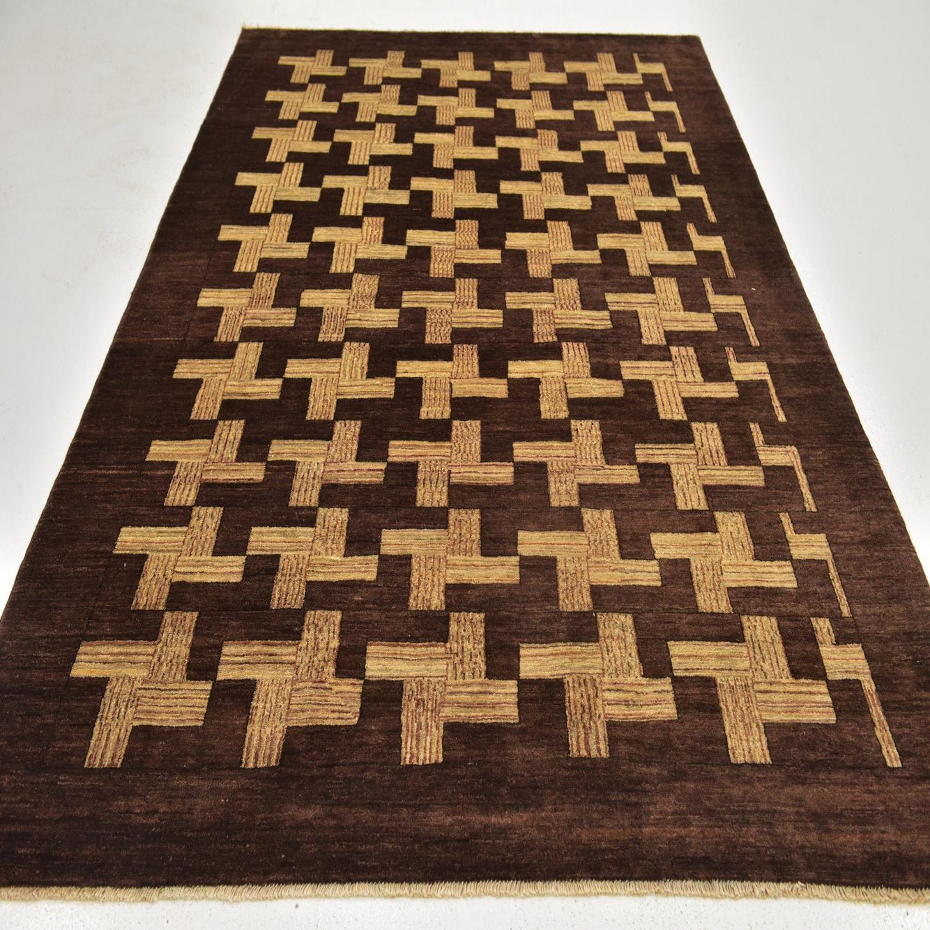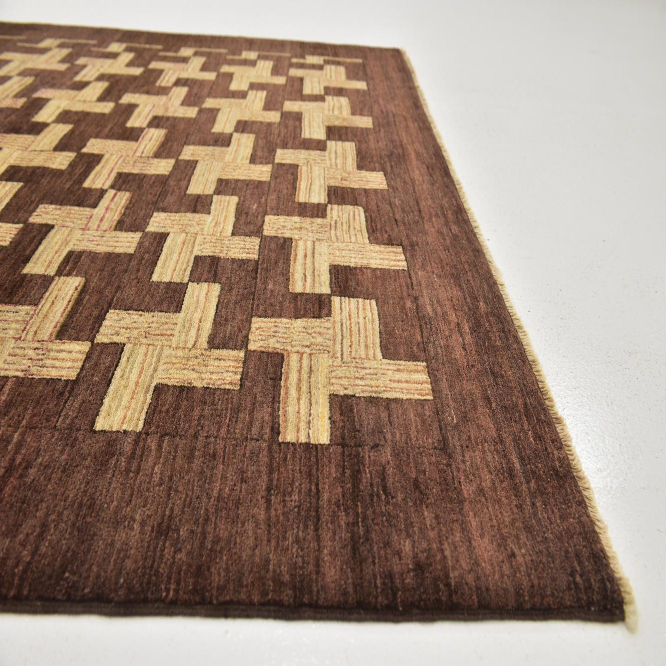 A 6x9 rectangular brown wool area rug with a modern abstract pattern of interlocking tan and brown shapes.