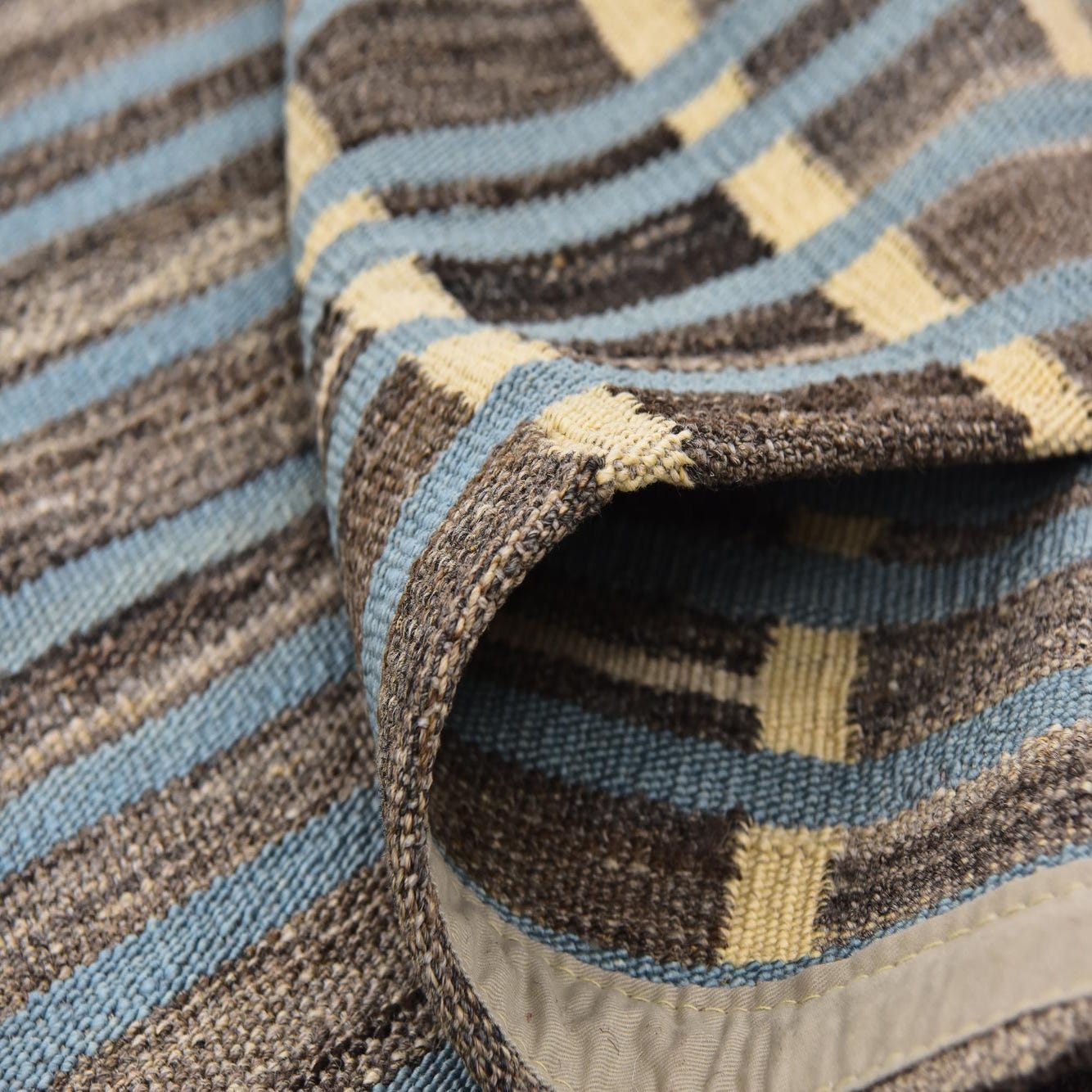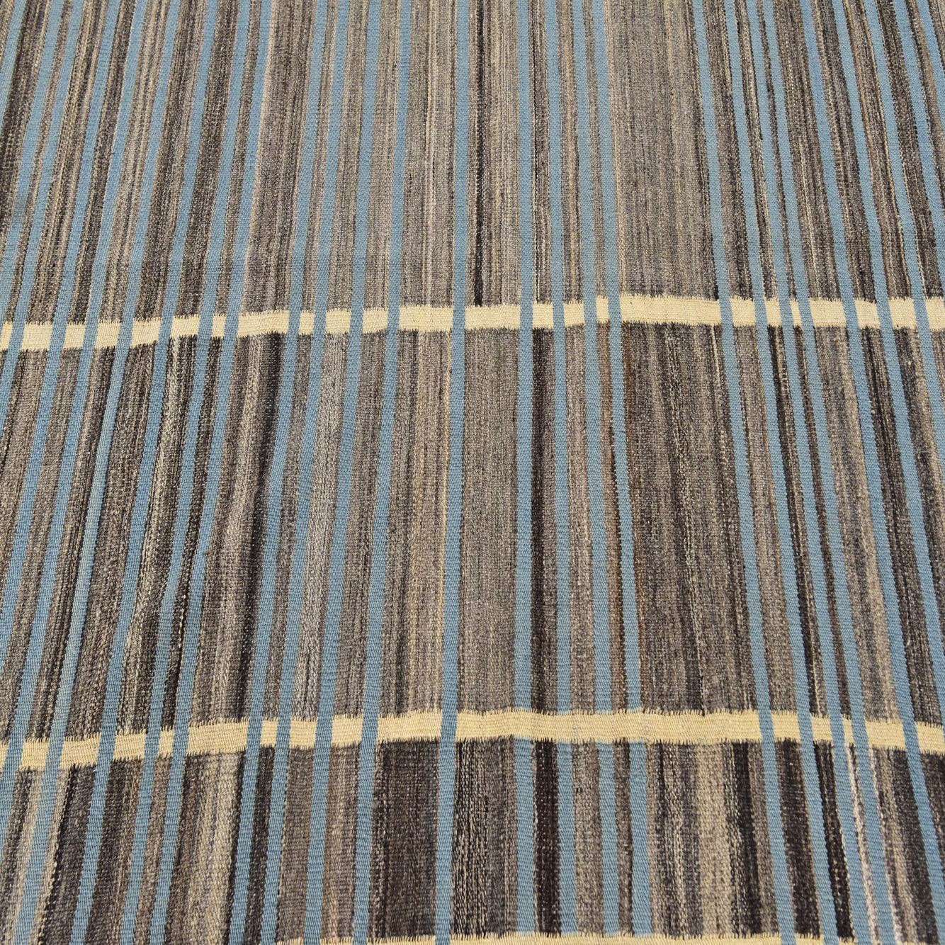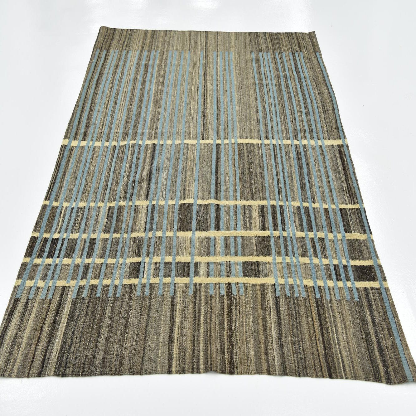A 6x9 rectangular Kilim Modern wool rug featuring vertical brown and tan stripes with horizontal and vertical light blue and cream accents.