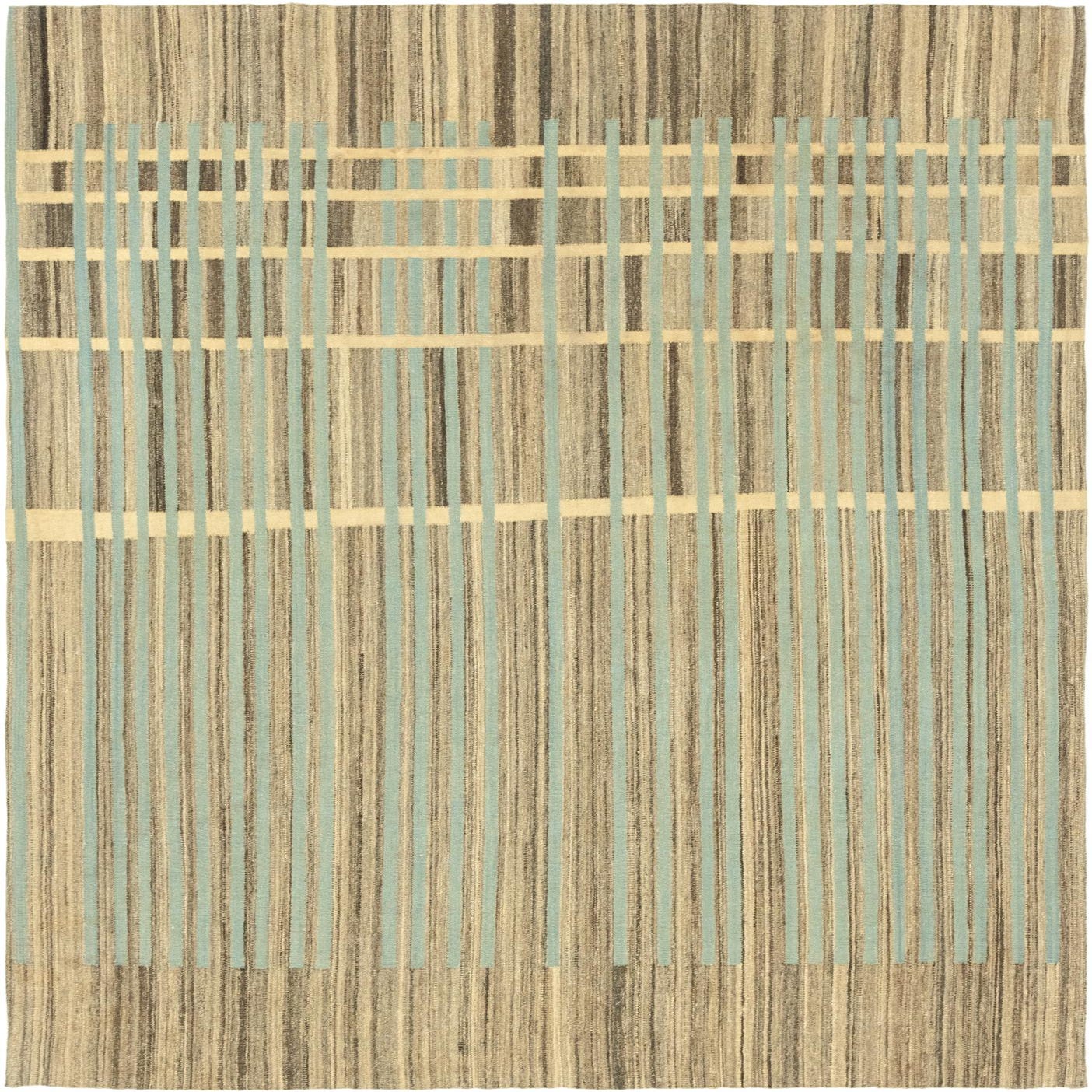 Part of the Kilim Modern collection, this hand-woven rug measures 6x9 feet and is crafted from 100% wool. It boasts a robust brown background complemented by linear patterns in soothing blue and cream hues, invoking a sense of order and modernity. The wool texture offers a tactile quality, with a flatweave construction that translates to a thin profile and a subtle, natural feel underfoot.
