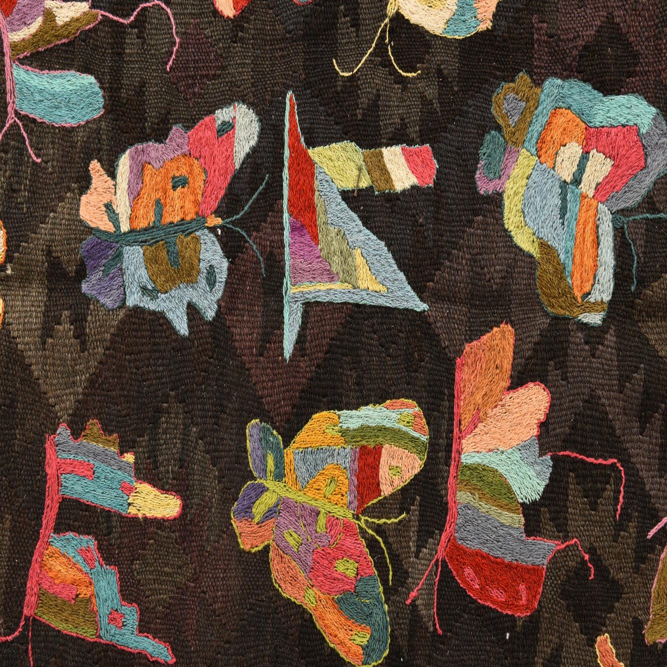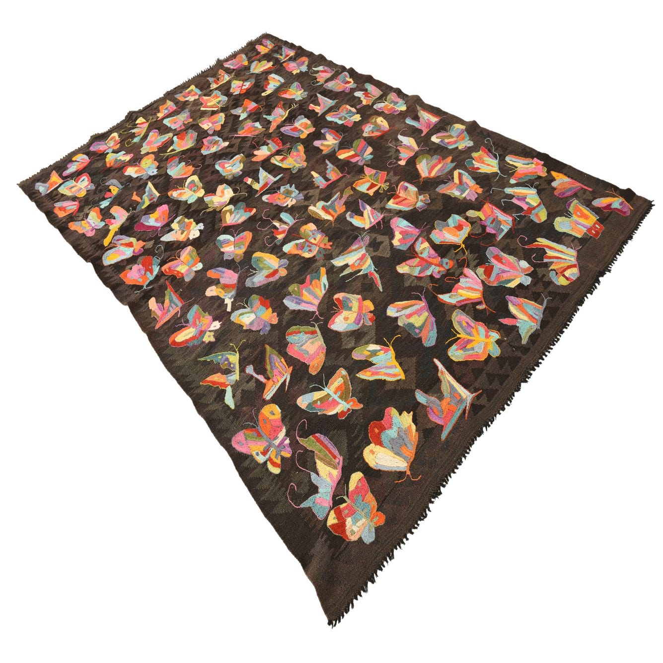 A 6x9 rectangular Kilim Suzani wool rug featuring a dark brown flatweave background with a vibrant, colorful butterfly pattern.