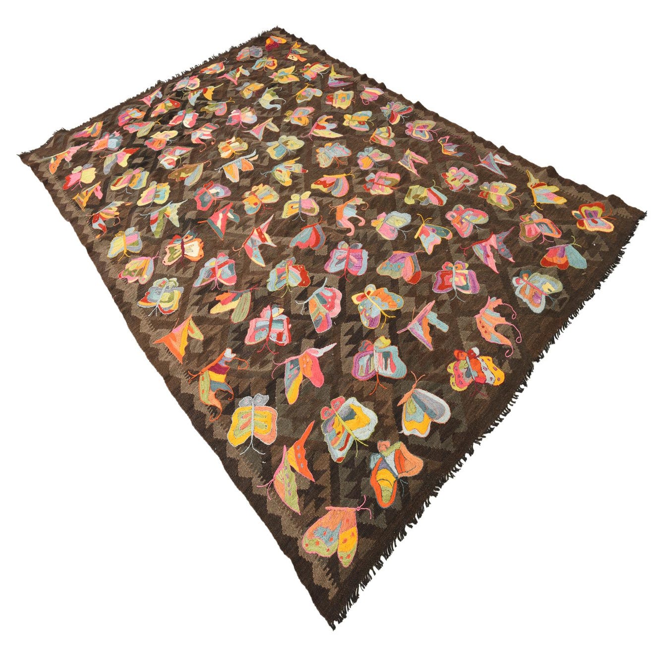 The Kilim Suzani collection presents a 6x9 hand-woven rug made of 100% wool, showcasing a captivating array of colors set against a brown background. This piece features an intriguing pattern of stylized botanical and butterfly motifs rendered in a vivid color palette, including brown, beige, black, blue, burgundy, ivory, light blue, light brown, light green, light salmon, yellow, teal, terracotta, turquoise, pink, peach, purple, red, gold, gray, and green. The colors are arranged to create a dynamic visual tapestry, bringing an artisanal and whimsical flair to the design.