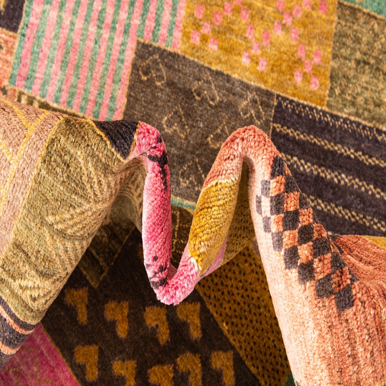 A 6x9 rectangular Modern Ziegler rug featuring a patchwork design with varied patterns in shades of brown, tan, pink, and teal.