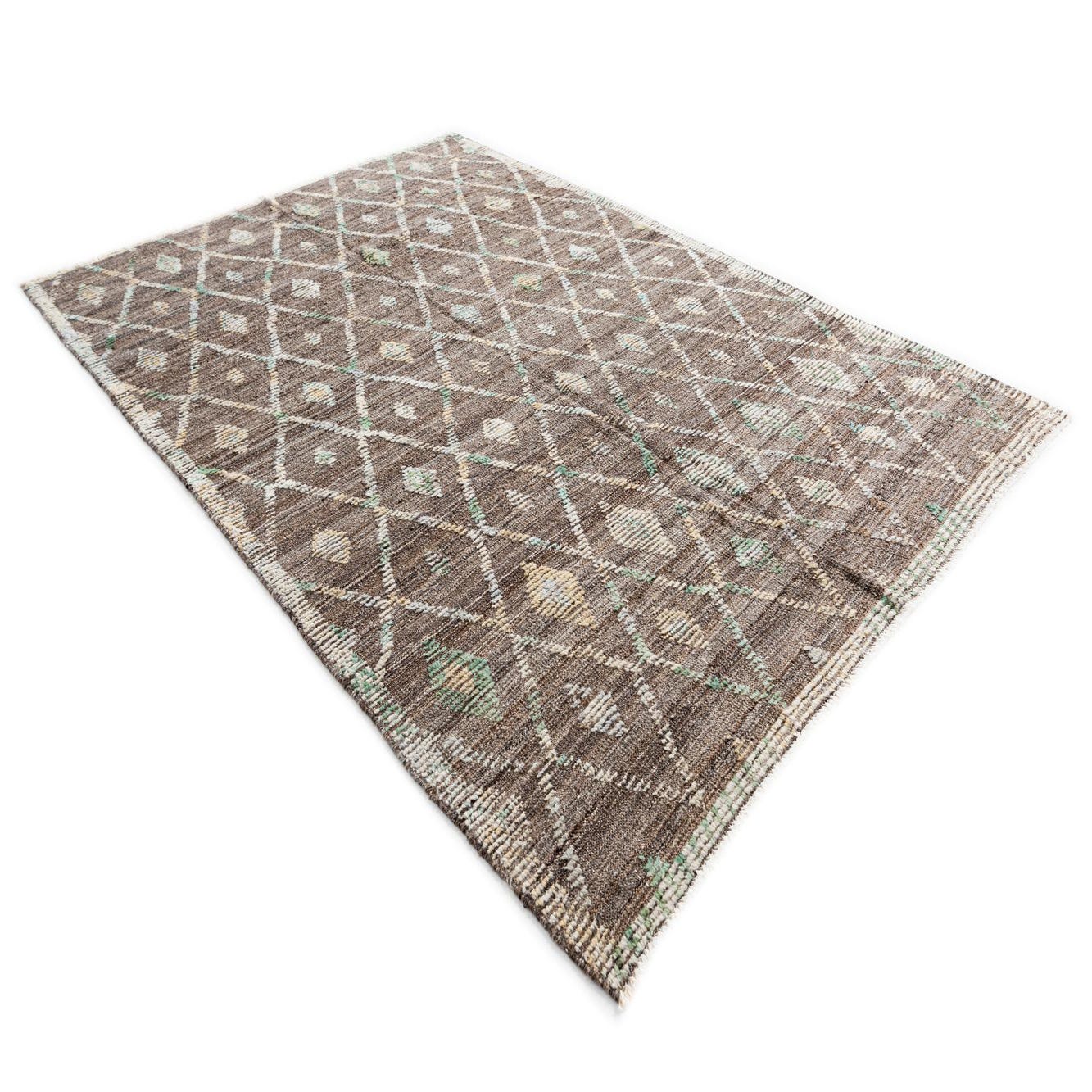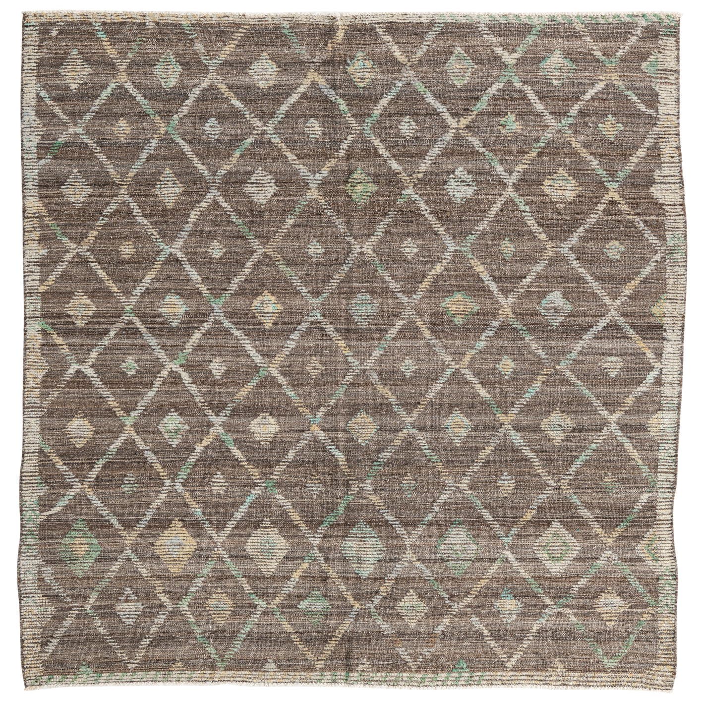A 6x9 rectangular brown wool rug featuring an abstract diamond pattern in tan, light blue, and green hues.