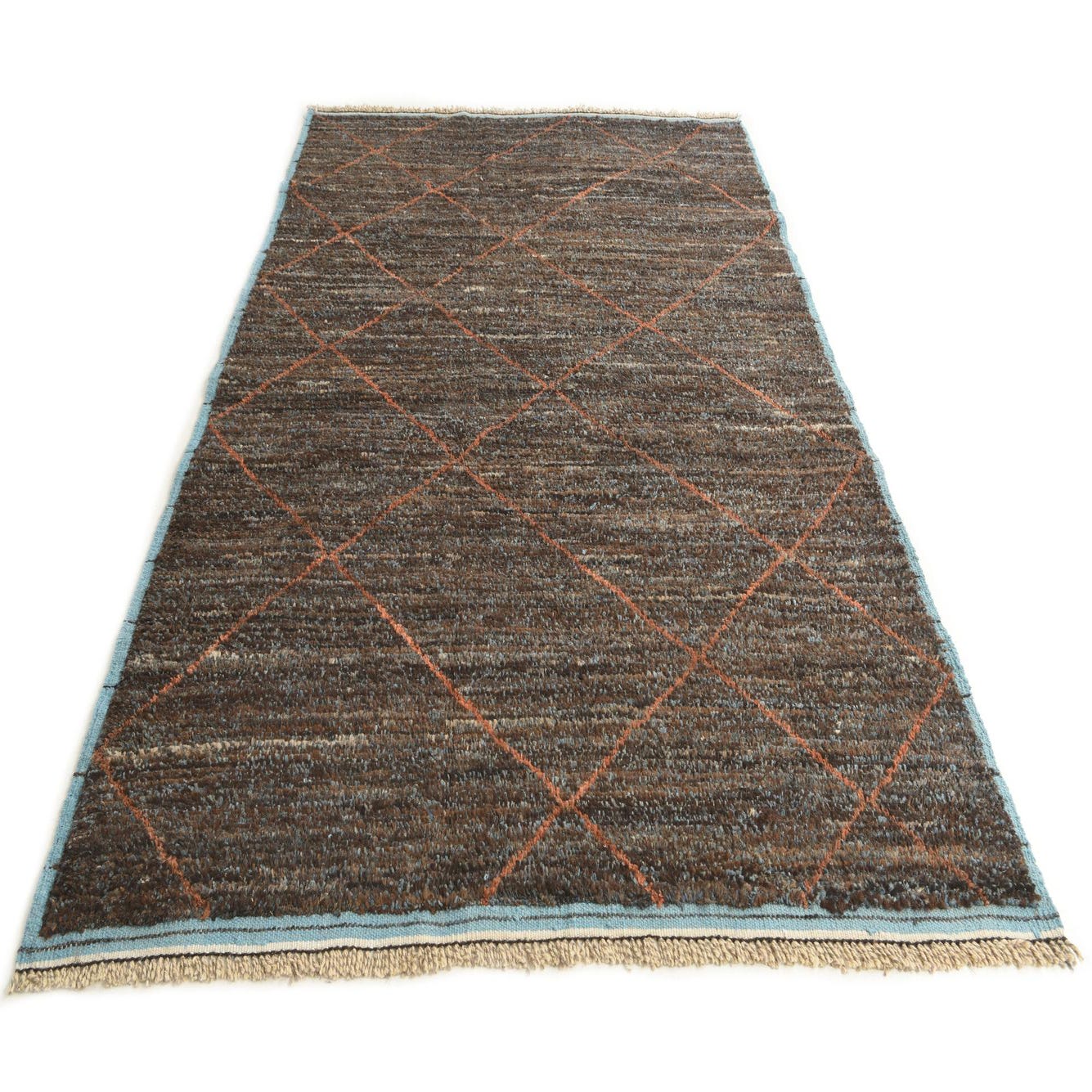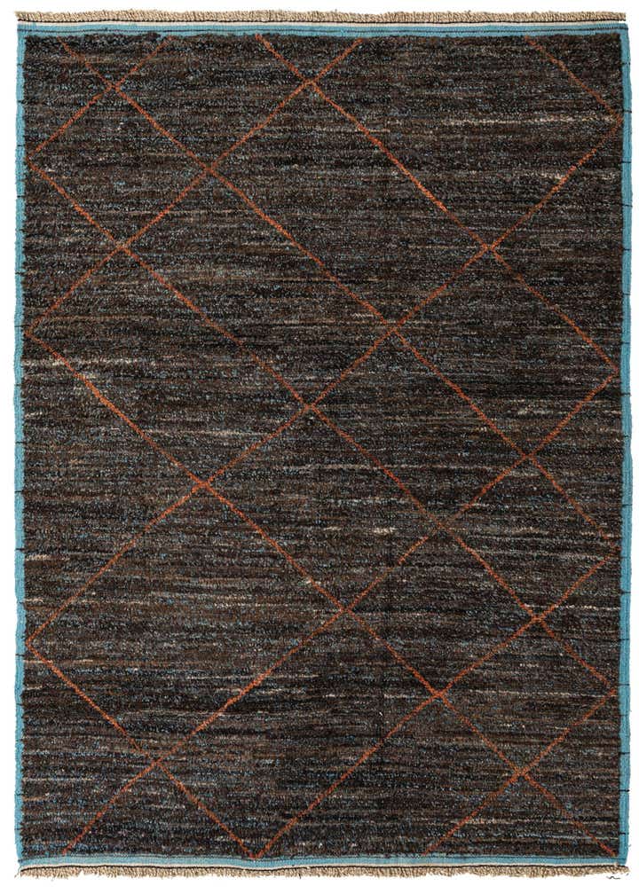 From the Moroccan collection, this hand-knotted rug features a pattern of bold diamond motifs that create a dynamic and engaging layout. The warm brown background showcases intersecting lines in terracotta that pop against the subtle hints of blue edging. The texture of the rug is enriched by the high-quality 100% wool construction, offering both durability and a soft underfoot. Measuring 6x9 feet, this rug is a versatile size, suitable for a variety of room settings. The fringe detail adds a classic finish to the rug's edges, enhancing its artisanal appeal.