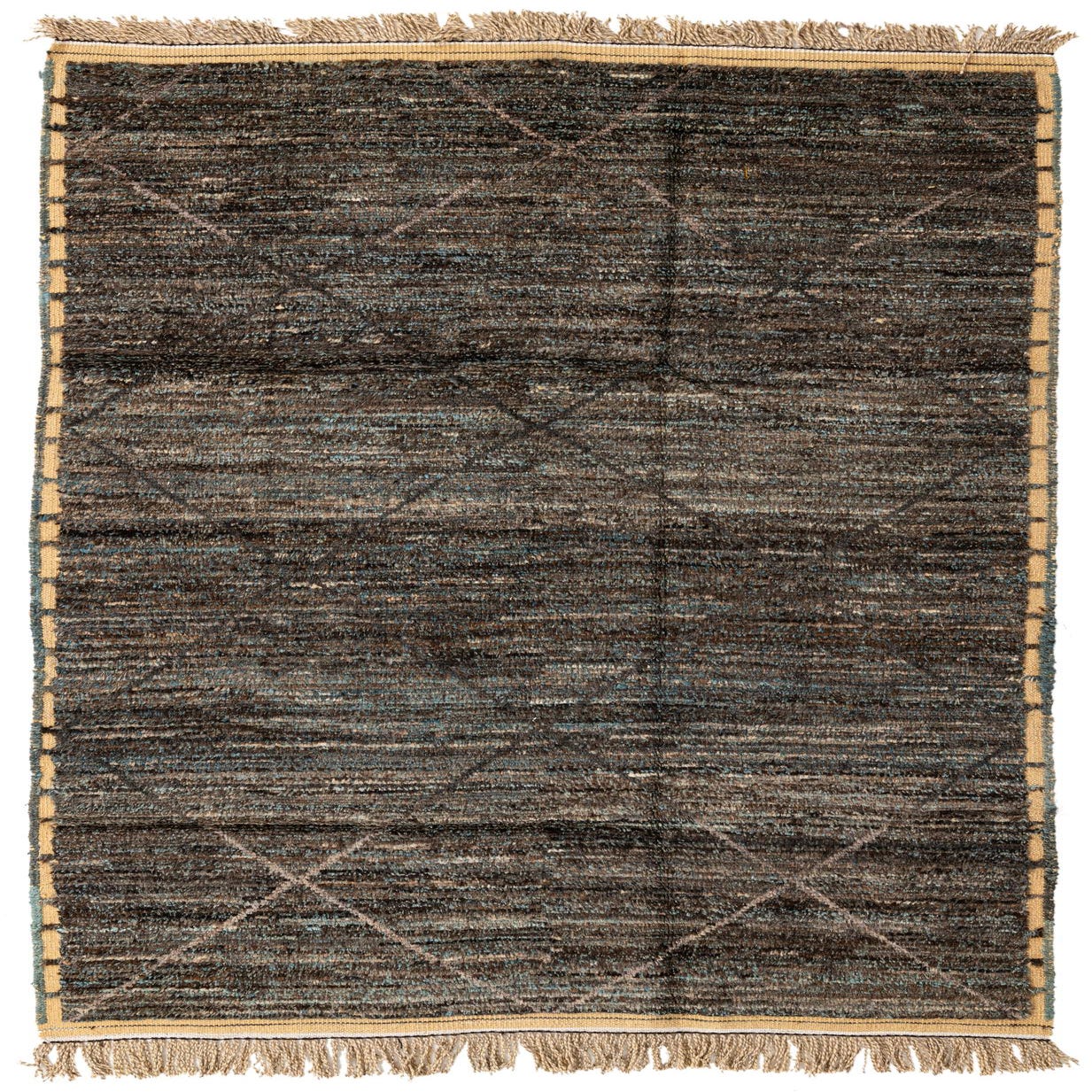 A rectangular 6x9 brown tribal shag rug with subtle diamond patterns and tan fringe, perfect for a living room.