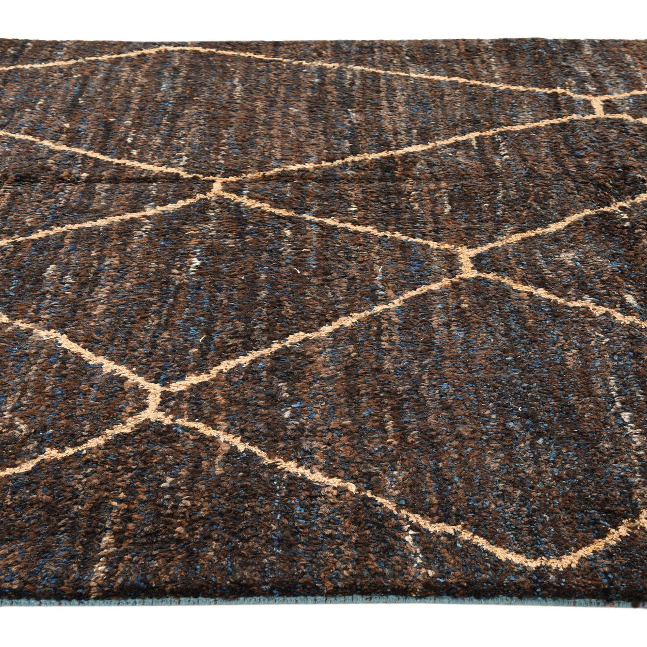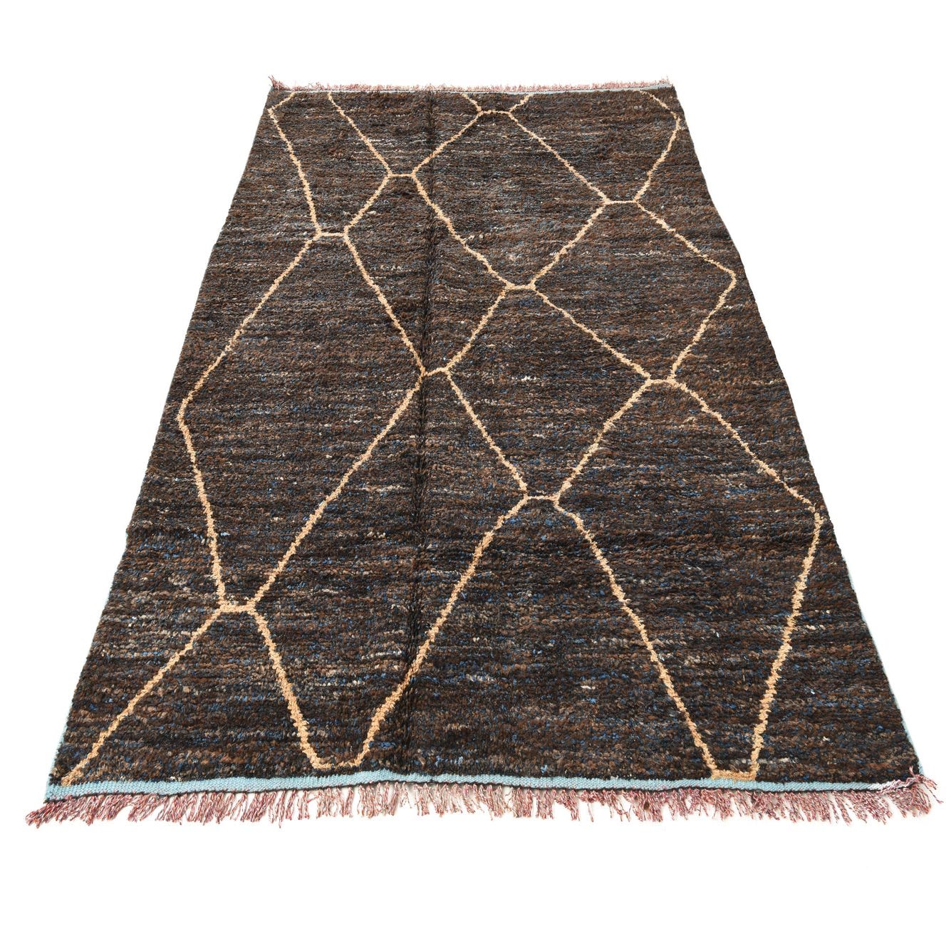 A 6x9 rectangular brown shag rug with a tan diamond tribal pattern and subtle blue accents, handmade for indoor use.