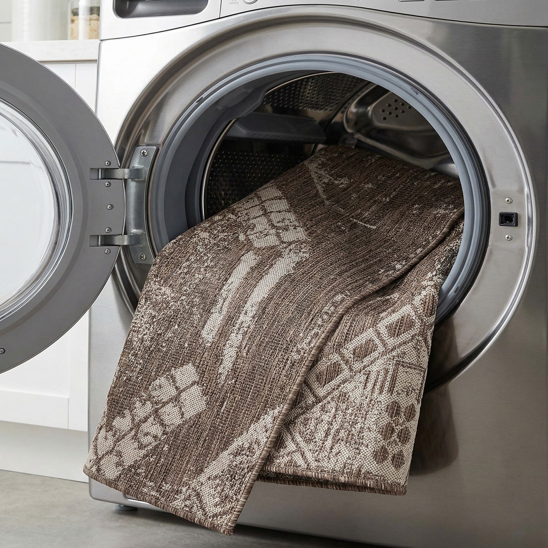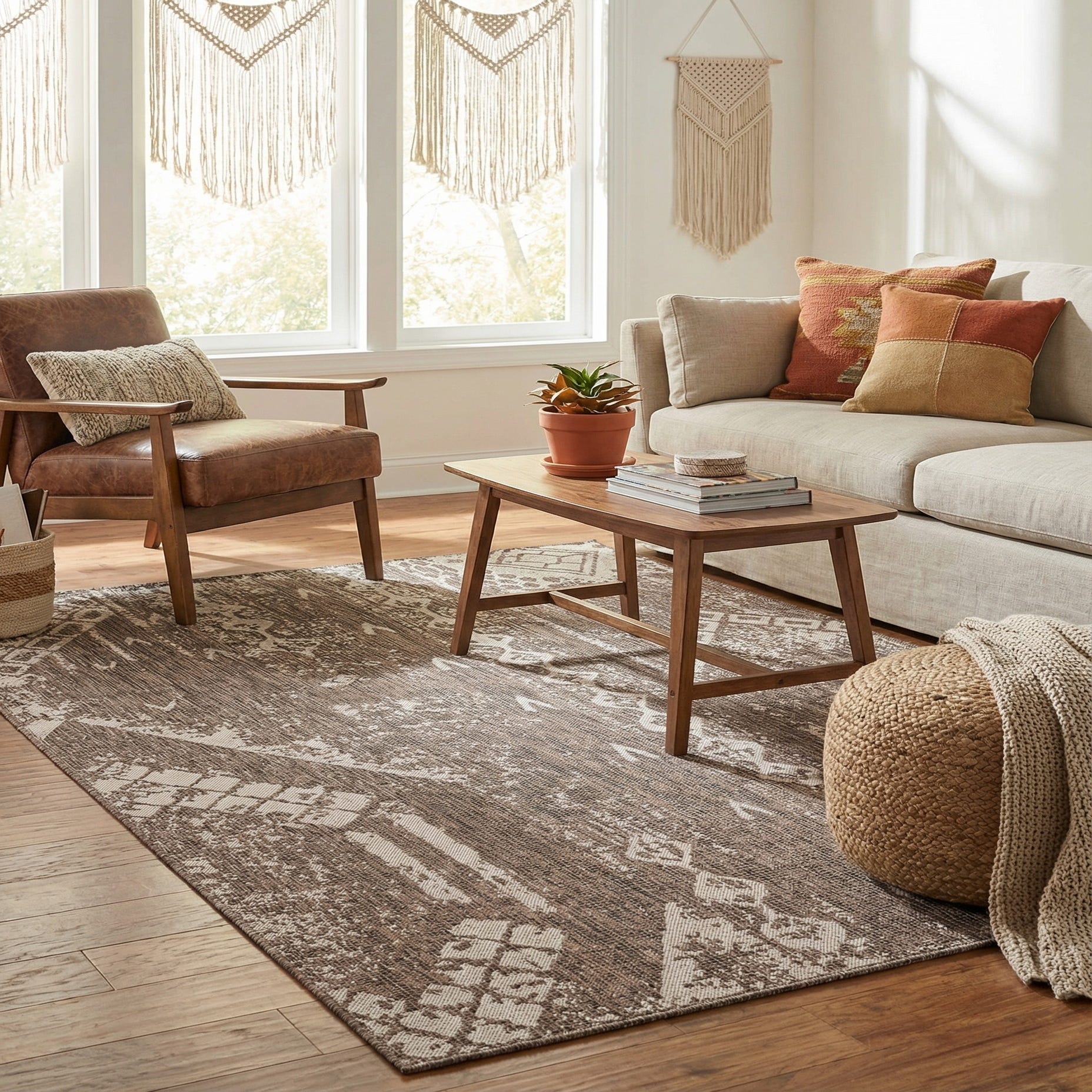A 6x9 rectangular brown and tan modern area rug with a distressed bohemian geometric pattern, suitable for indoor or outdoor use.