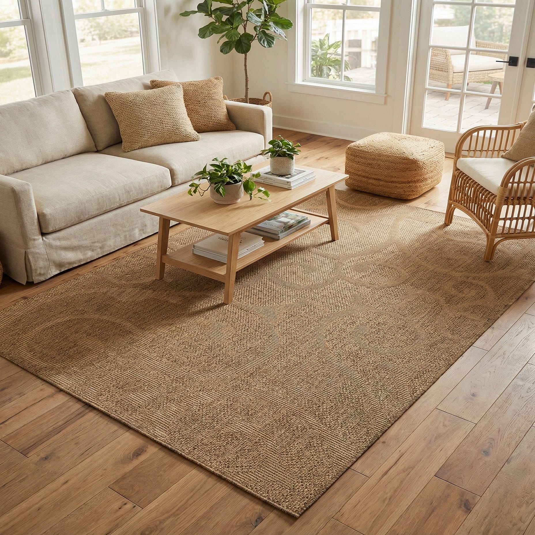 This rug works well for covered patios, sunrooms, or a casual living room where natural tones and durable materials are desired. Pair it with rattan or teak furniture and linen cushions for a relaxed, layered look, or use it to anchor an outdoor dining set where neutral upholstery and warm wood tones already exist. It also complements transitional interiors that mix traditional motifs with contemporary lines, bringing subtle pattern and earthy color without overwhelming the scheme.